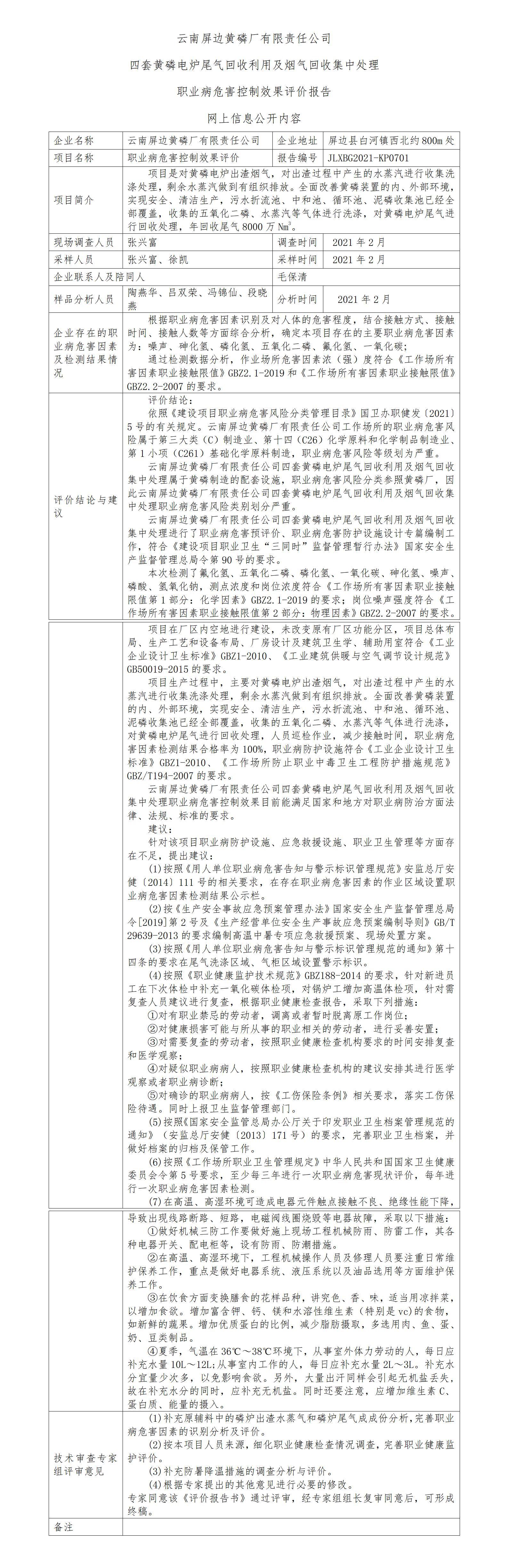 云南屏边黄磷厂有限责任公司四套黄磷电炉尾气回收利用及烟气回收集中处理控制效果评价