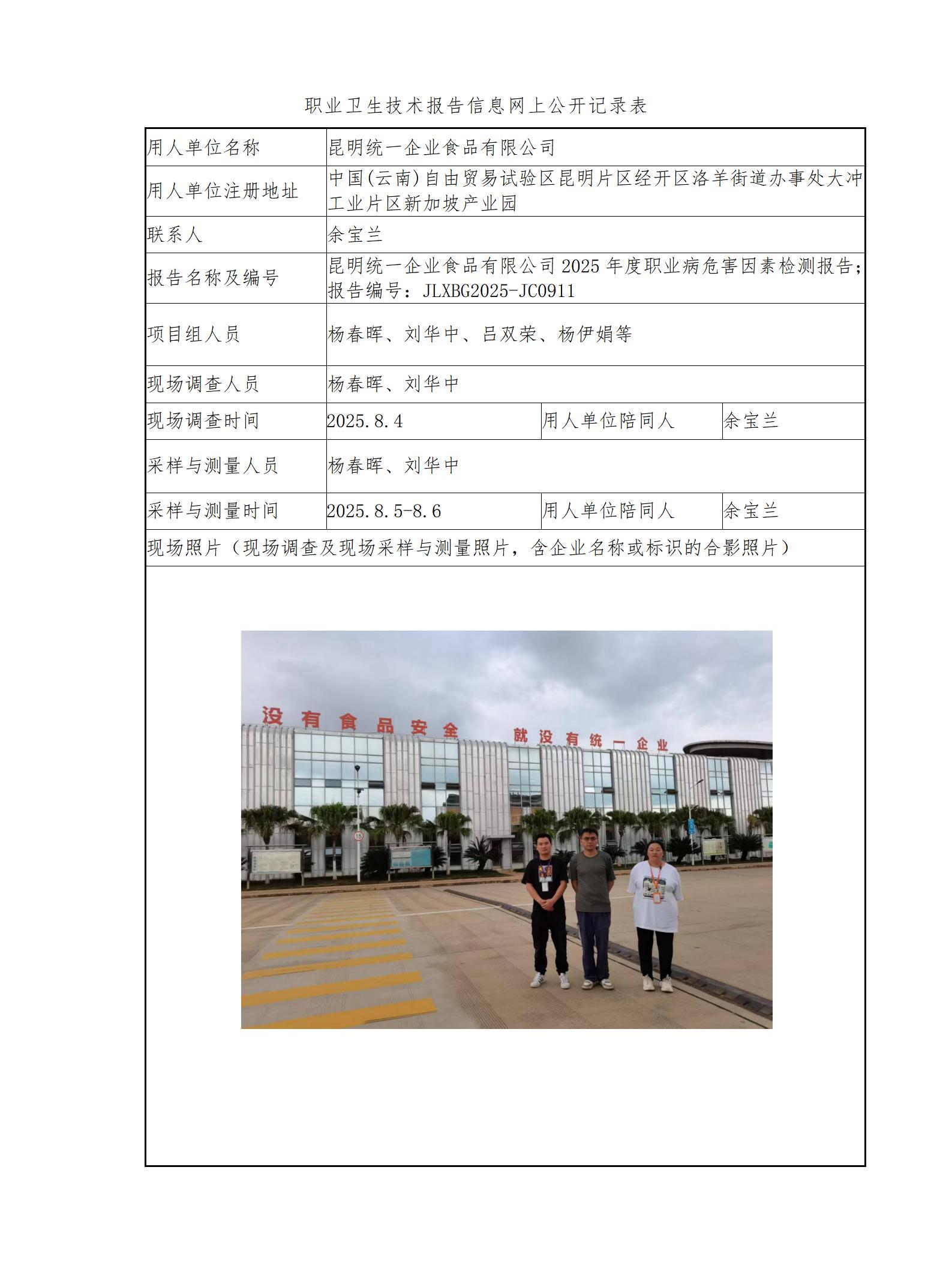 昆明统一企业食品有限公司2025年度职业病危害因素检测报告