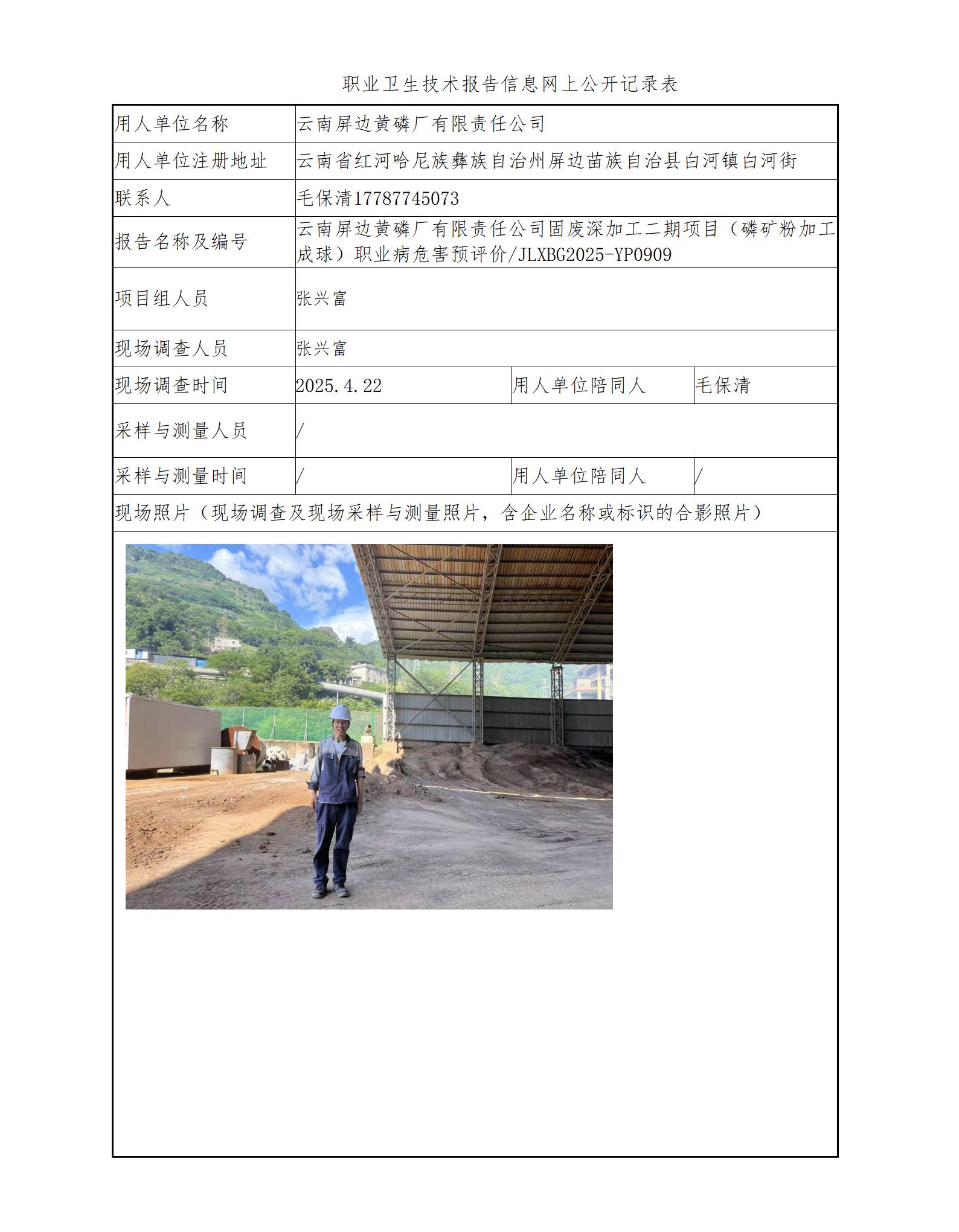 云南屏边黄磷厂有限责任公司固废深加工二期项目(磷矿粉加工成球)职业病危害预评价