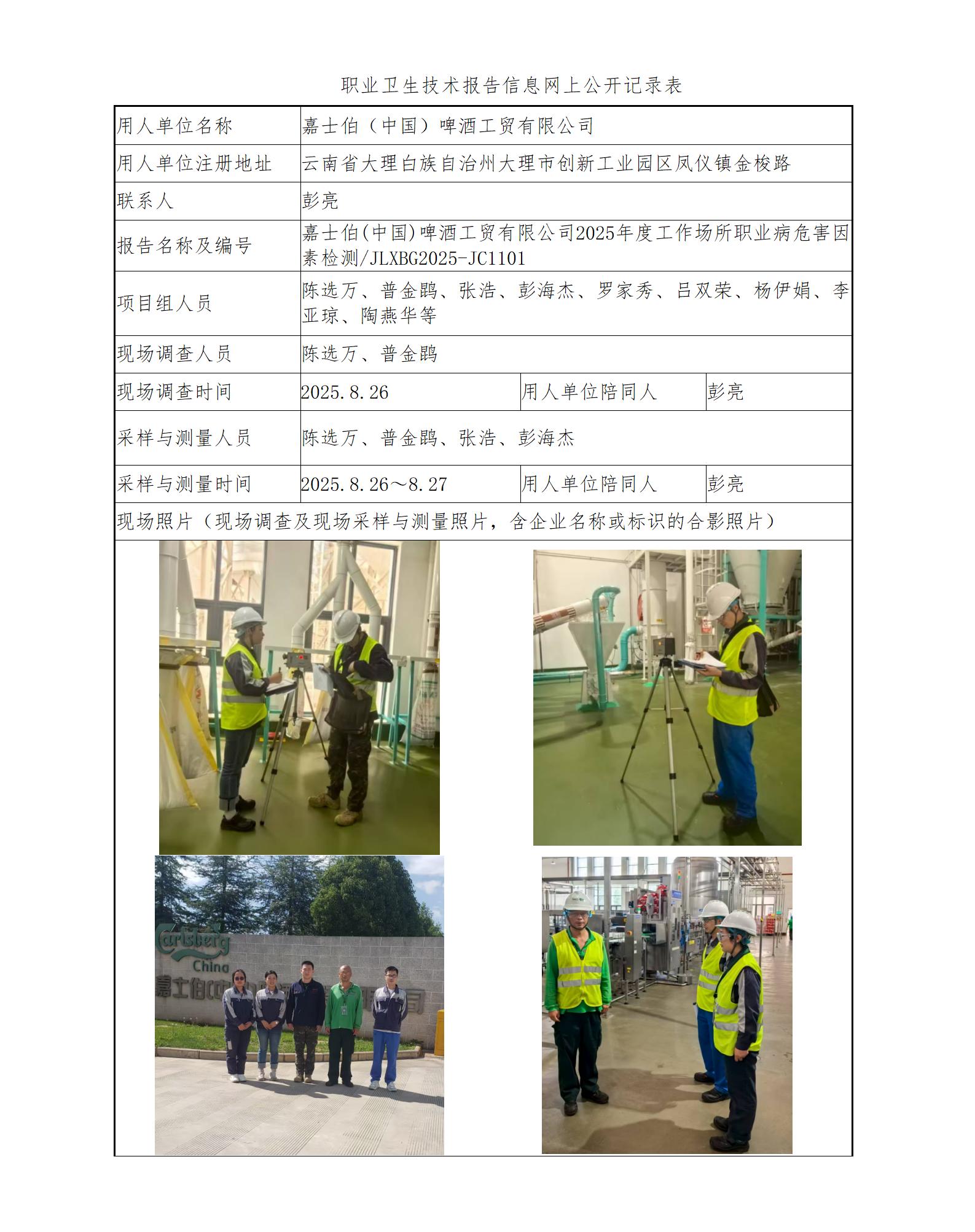 嘉士伯(中国)啤酒工贸有限公司2025年度工作场所职业病危害因素检测
