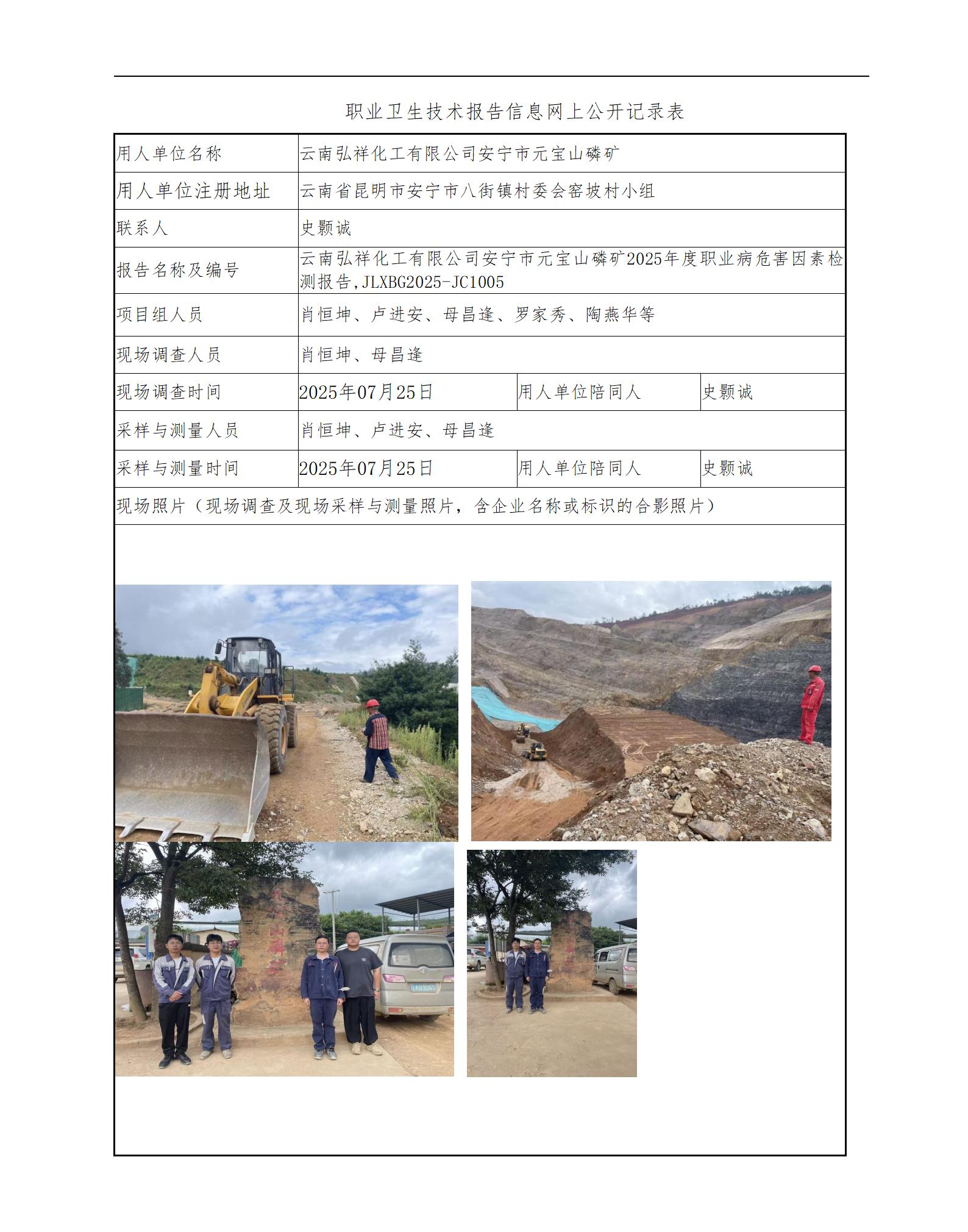 云南弘祥化工有限公司安宁市元宝山磷矿2025年度职业病危害因素检测报告