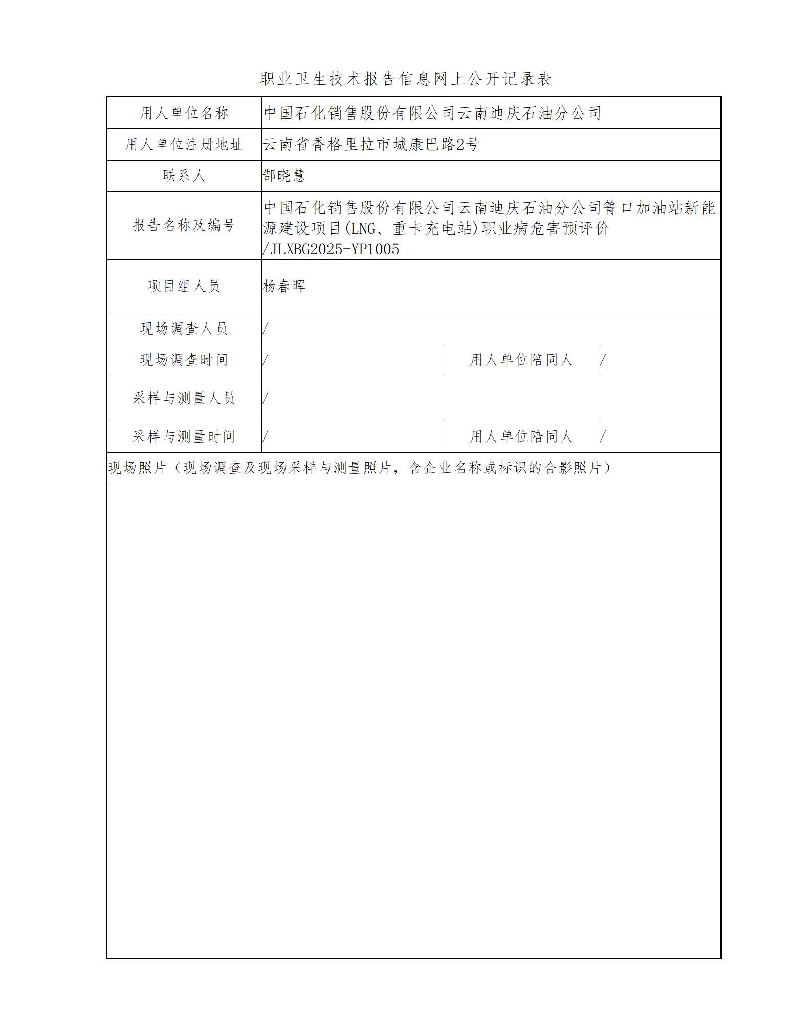 中国石化销售股份有限公司云南迪庆石油分公司箐口加油站新能源建设项目(LNG、重卡充电站)职业病危害预评价