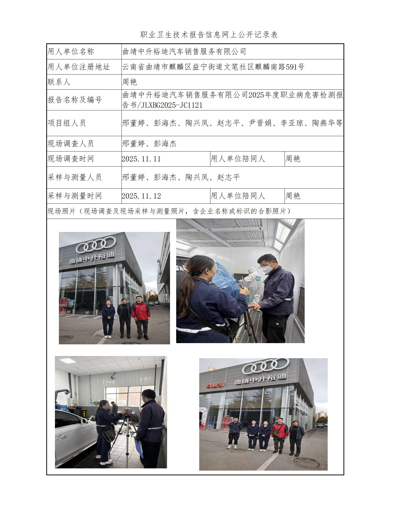 曲靖中升裕迪汽车销售服务有限公司2025年度职业病危害检测报告书