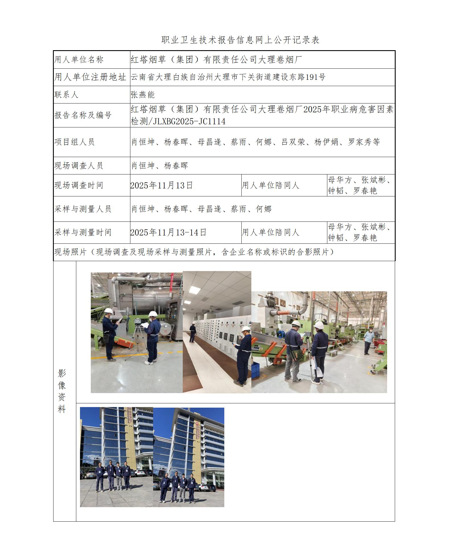 红塔烟草(集团)有限责任公司大理卷烟厂2025年职业病危害因素检测
