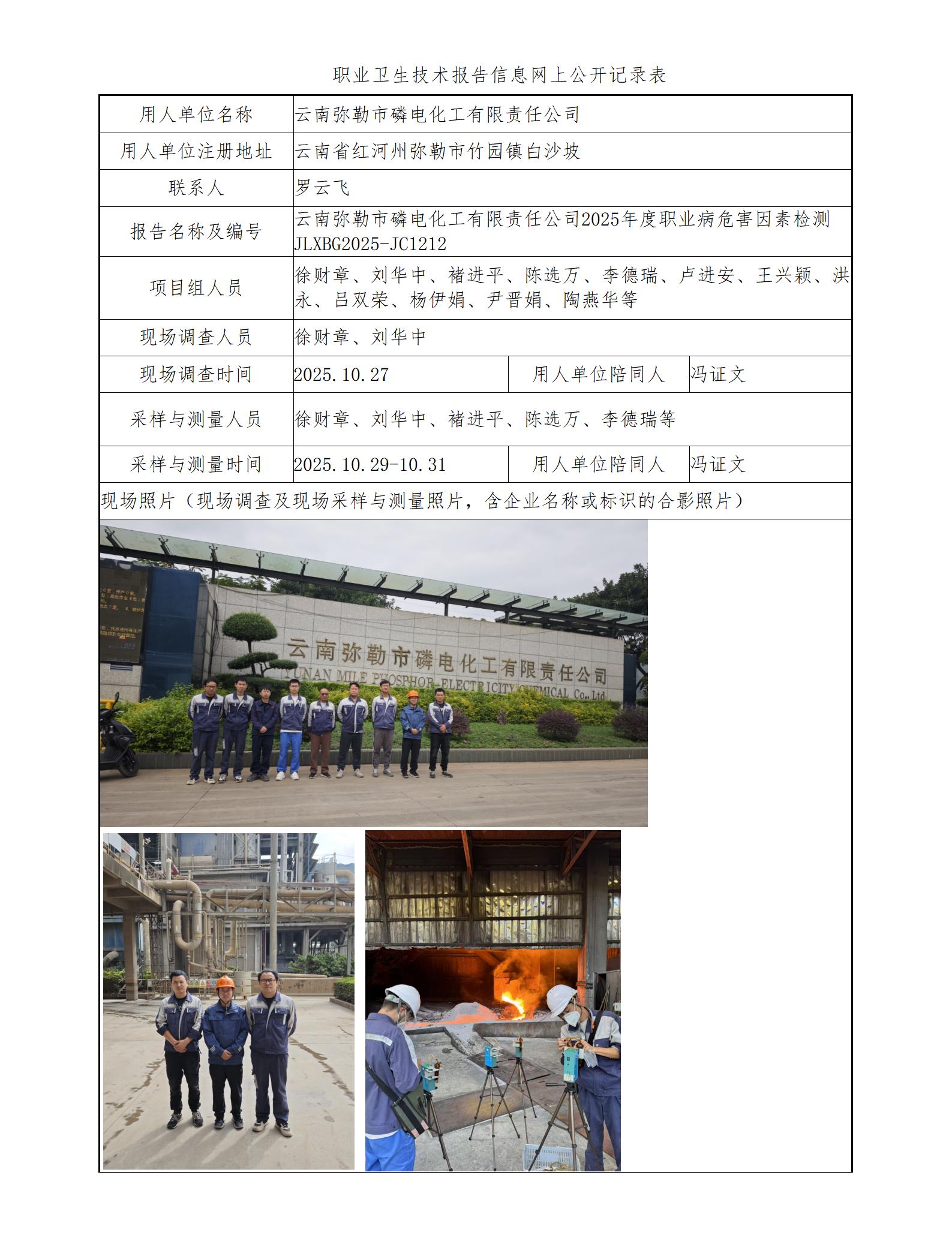 云南弥勒市磷电化工有限责任公司2025年度职业病危害因素检测