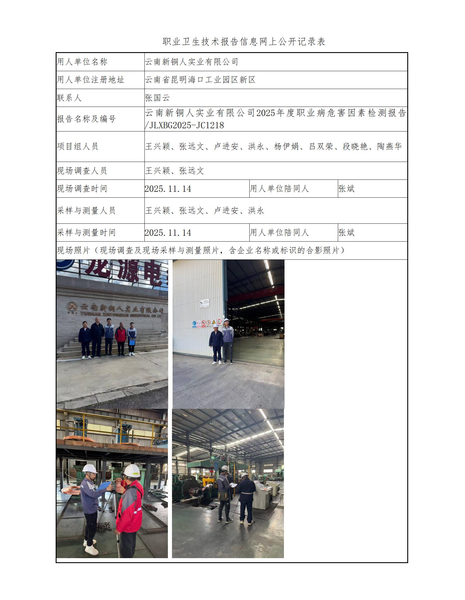 云南新铜人实业有限公司2025年度职业病危害因素检测报告