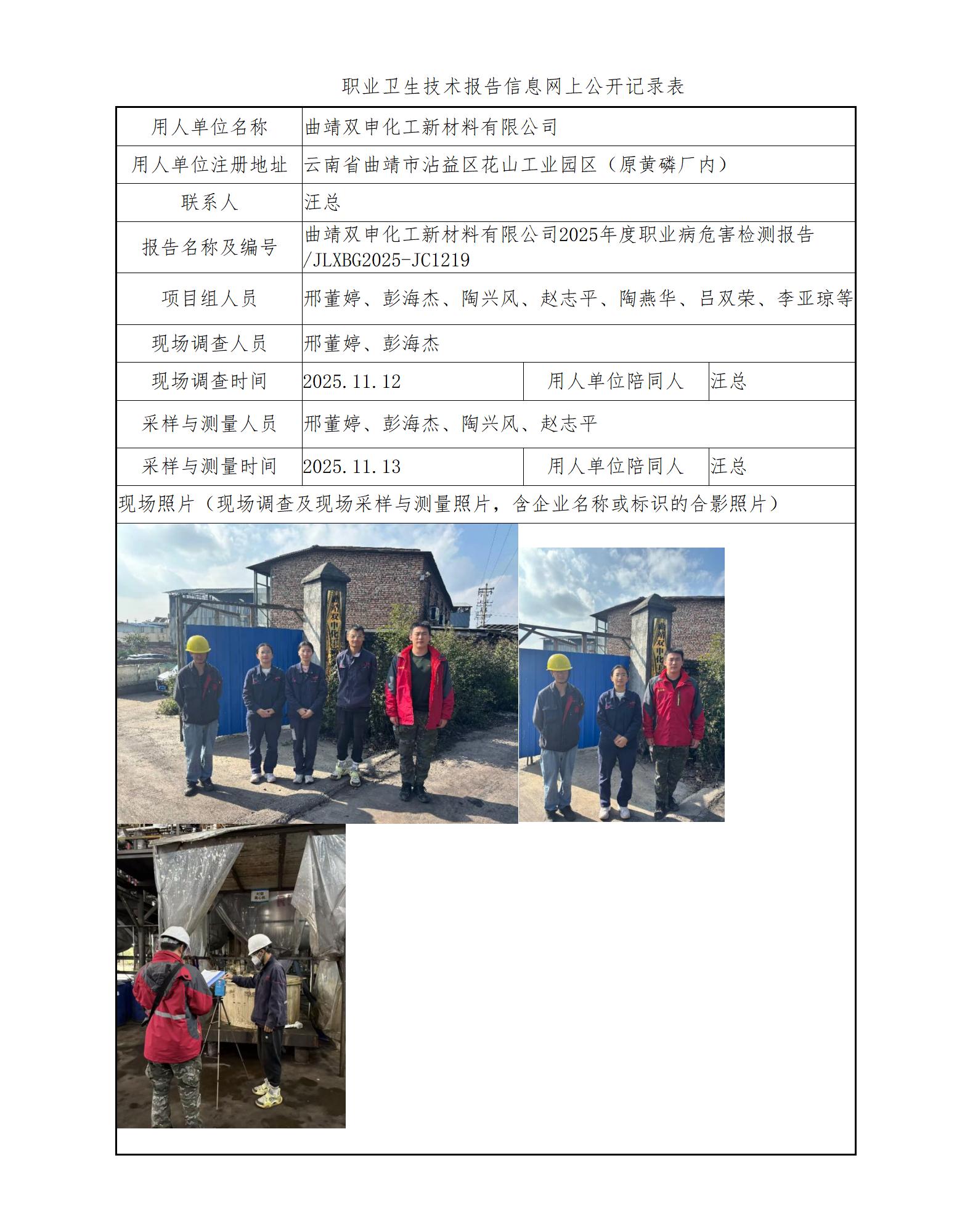 曲靖双申化工新材料有限公司2025年度职业病危害检测报告