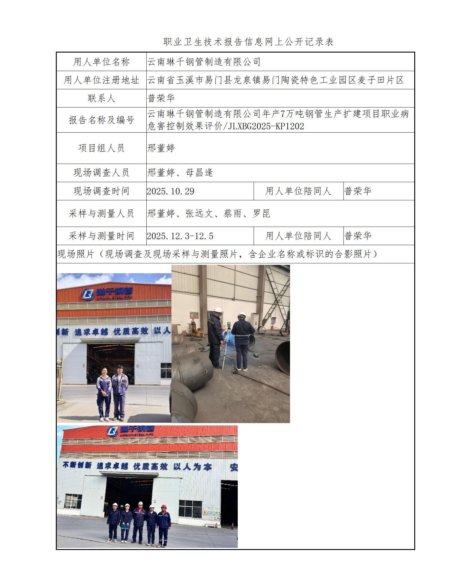 云南琳千钢管制造有限公司年产7万吨钢管生产扩建项目职业病危害控制效果评价