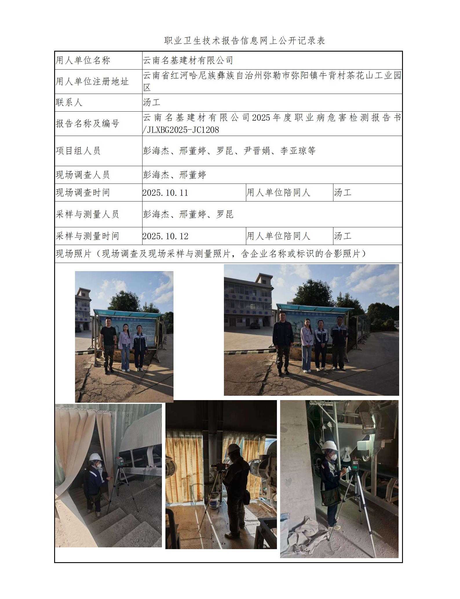 云南名基建材有限公司2025年度职业病危害检测报告书