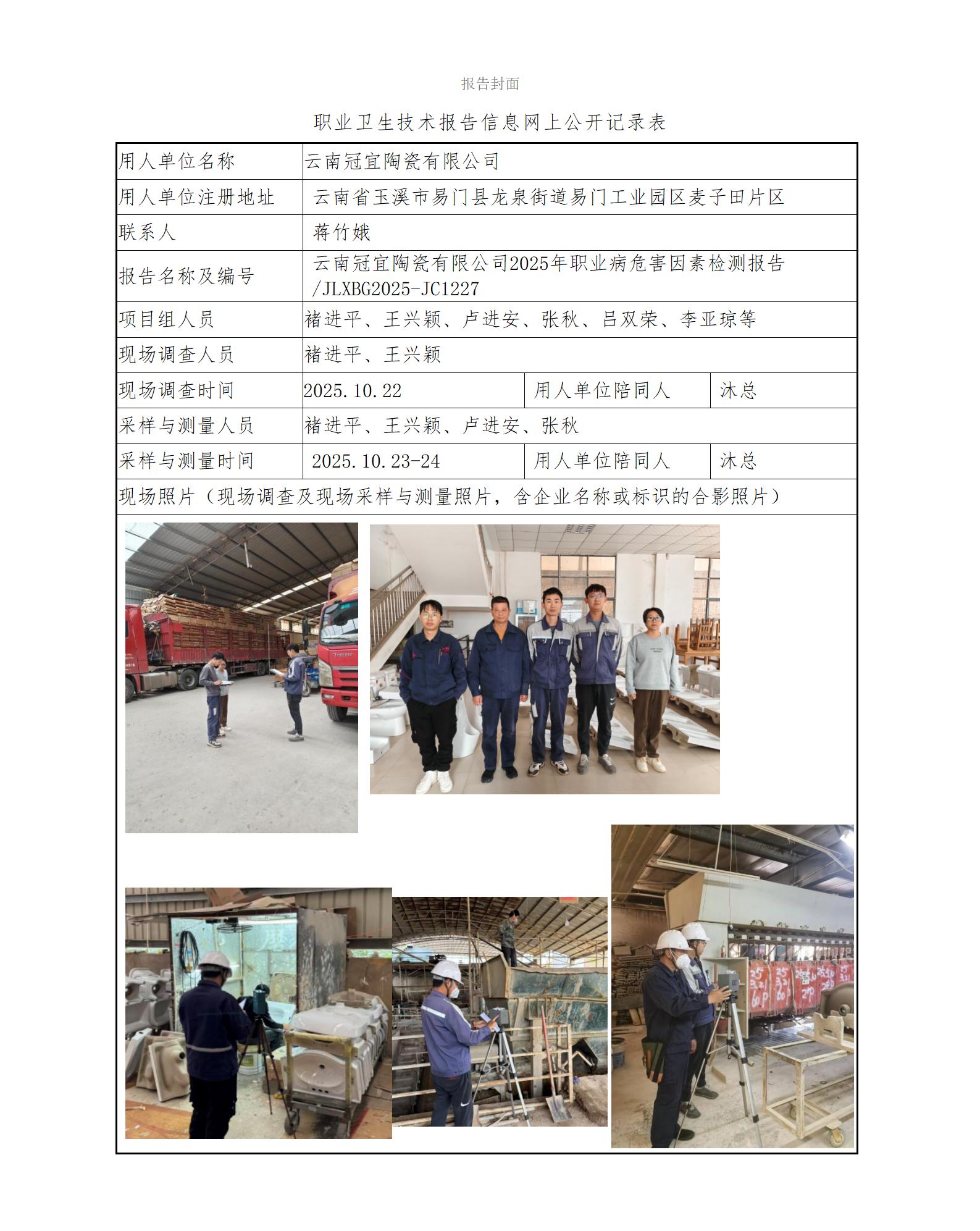 云南冠宜陶瓷有限公司2025年职业病危害因素检测报告