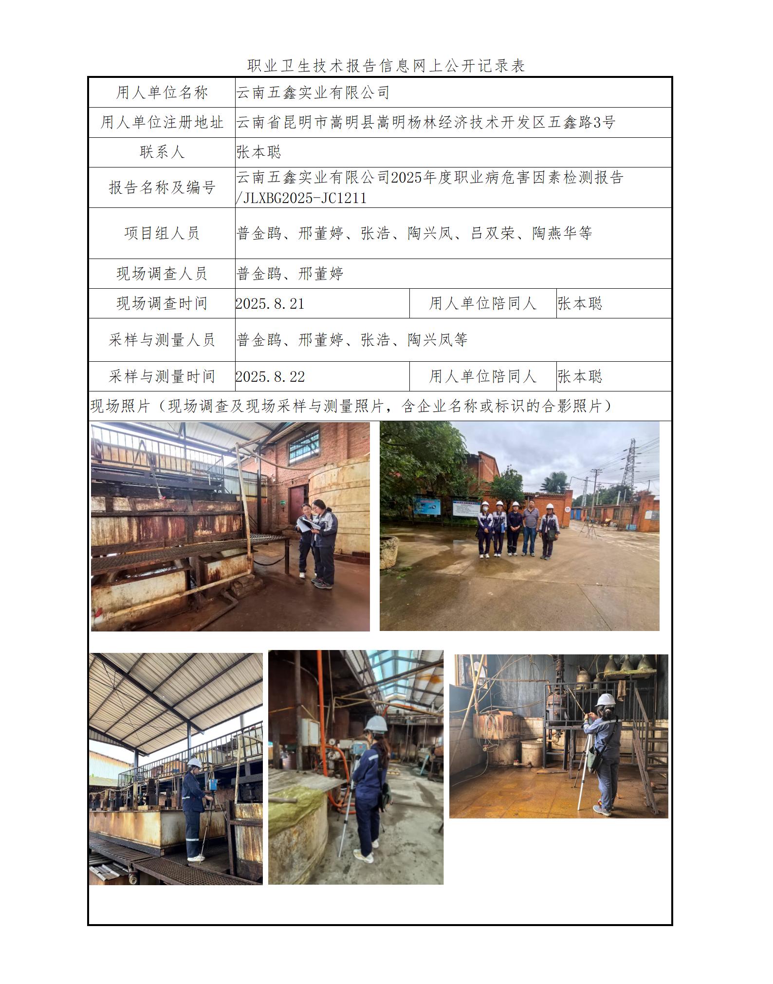 云南五鑫实业有限公司2025年度职业病危害因素检测报告