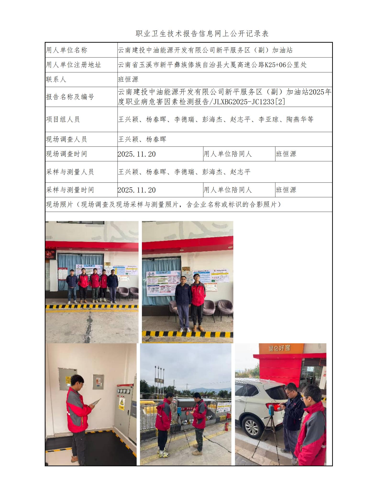 云南建投中油能源开发有限公司新平服务区(副)加油站2025年度职业病危害因素检测报告