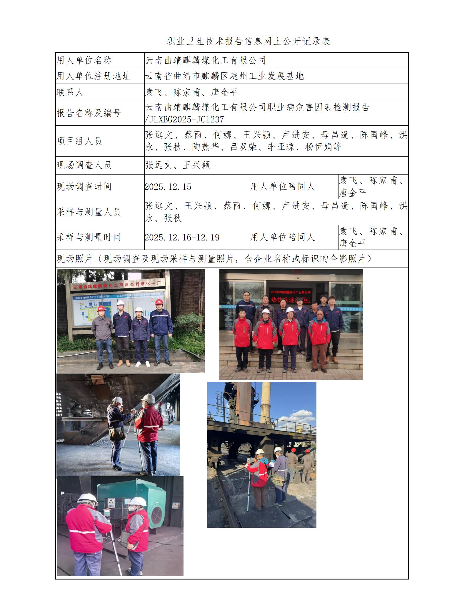 云南曲靖麒麟煤化工有限公司职业病危害因素检测报告