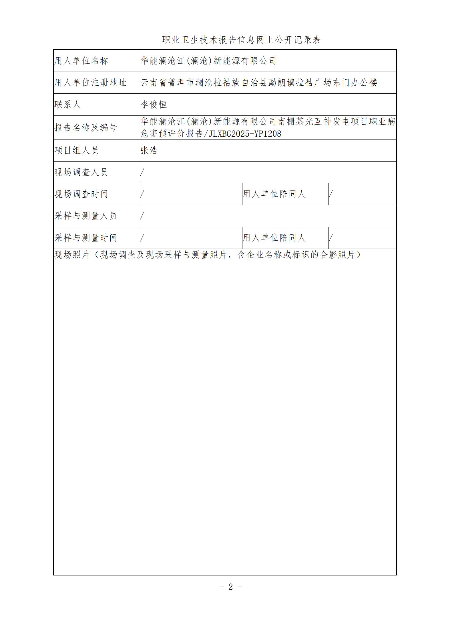 华能澜沧江(澜沧)新能源有限公司南栅茶光互补发电项目职业病危害预评价报告