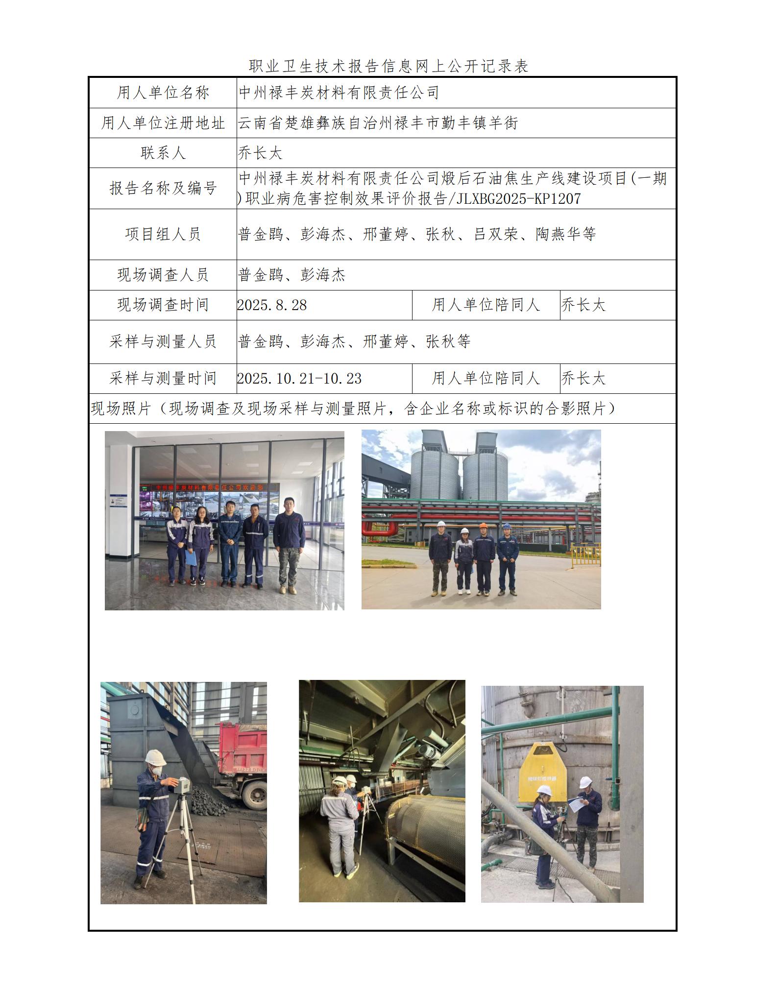 中州禄丰炭材料有限责任公司煅后石油焦生产线建设项目(一期)职业病危害控制效果评价报告