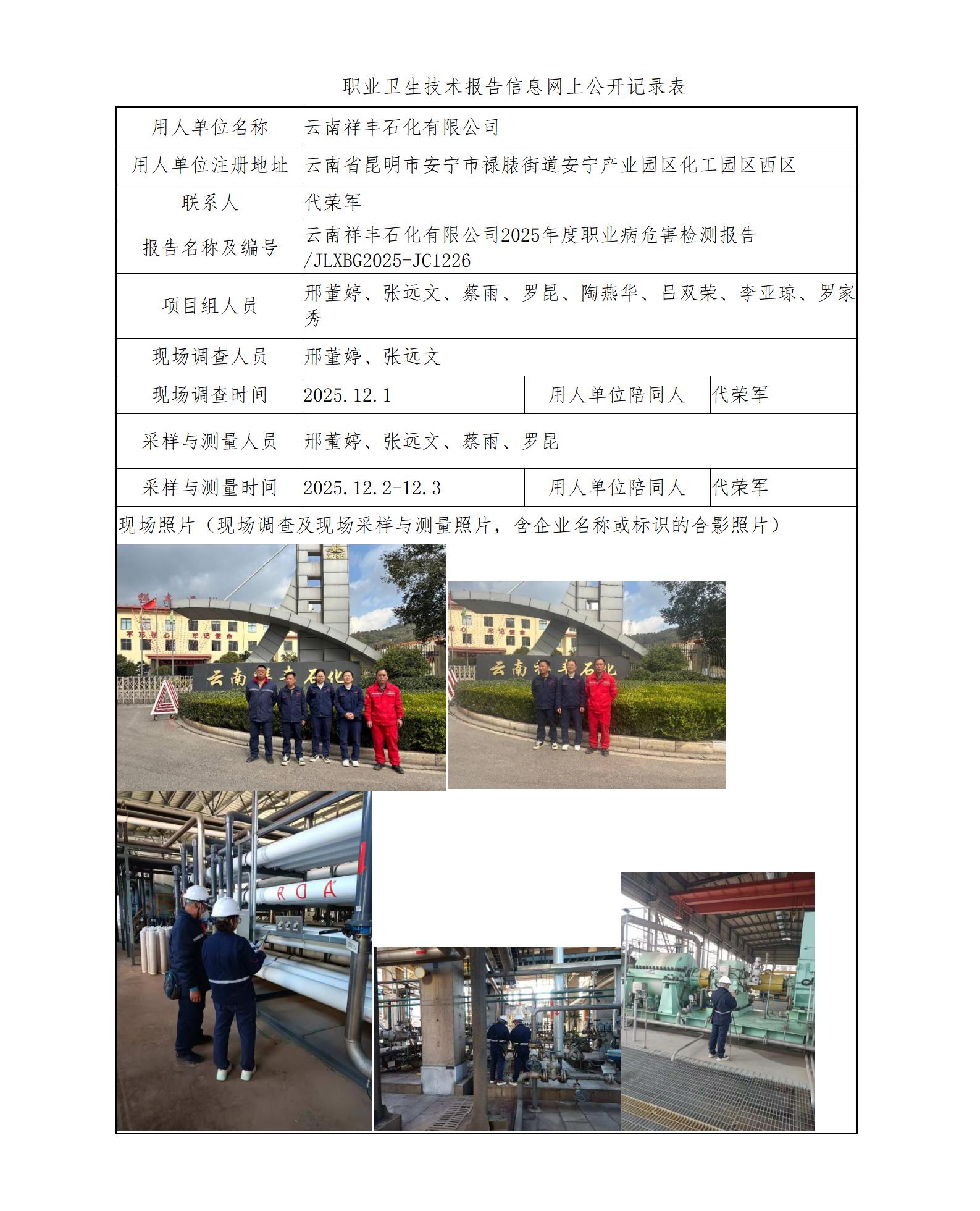 云南祥丰石化有限公司2025年度职业病危害检测报告