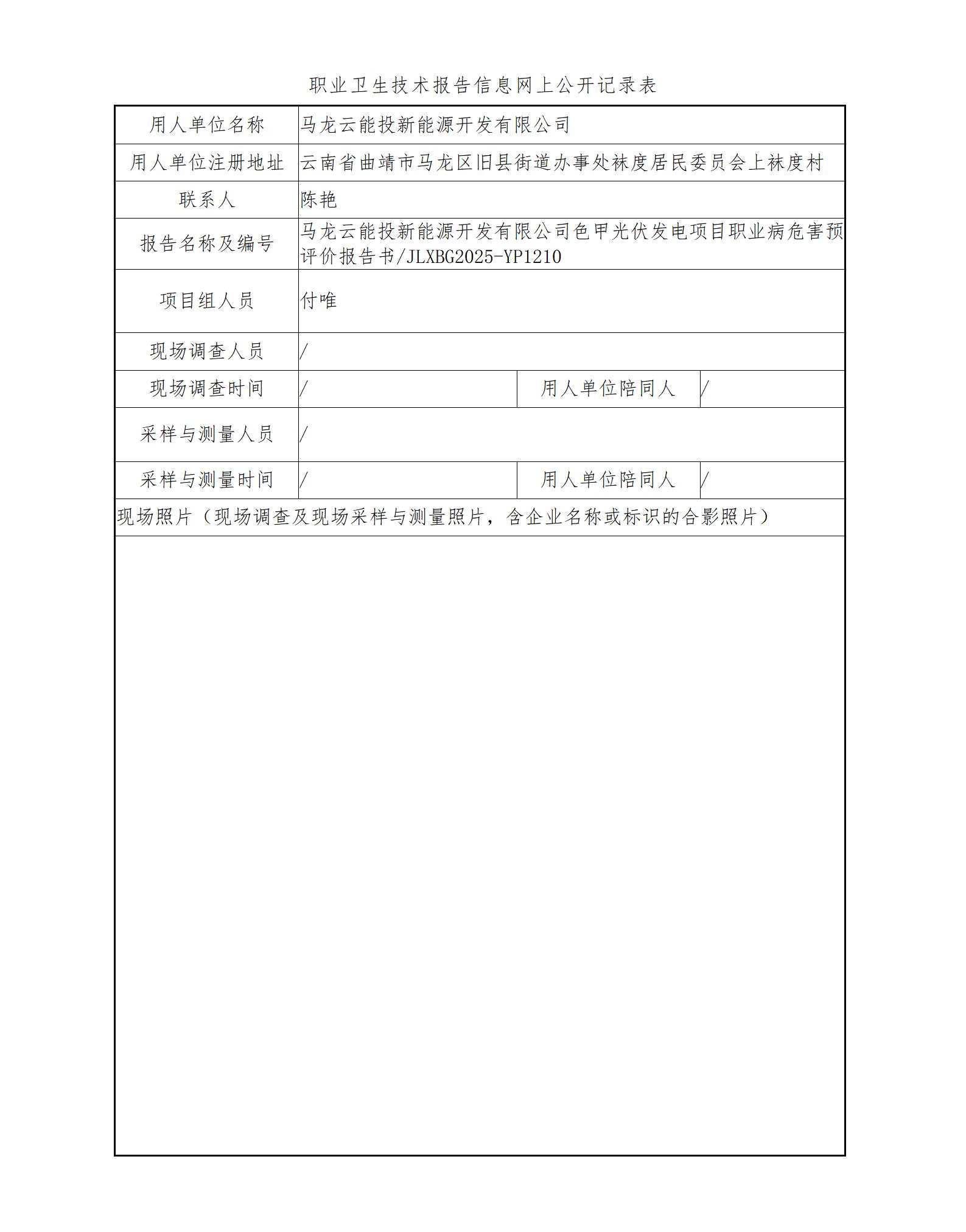 马龙云能投新能源开发有限公司色甲光伏发电项目职业病危害预评价报告书