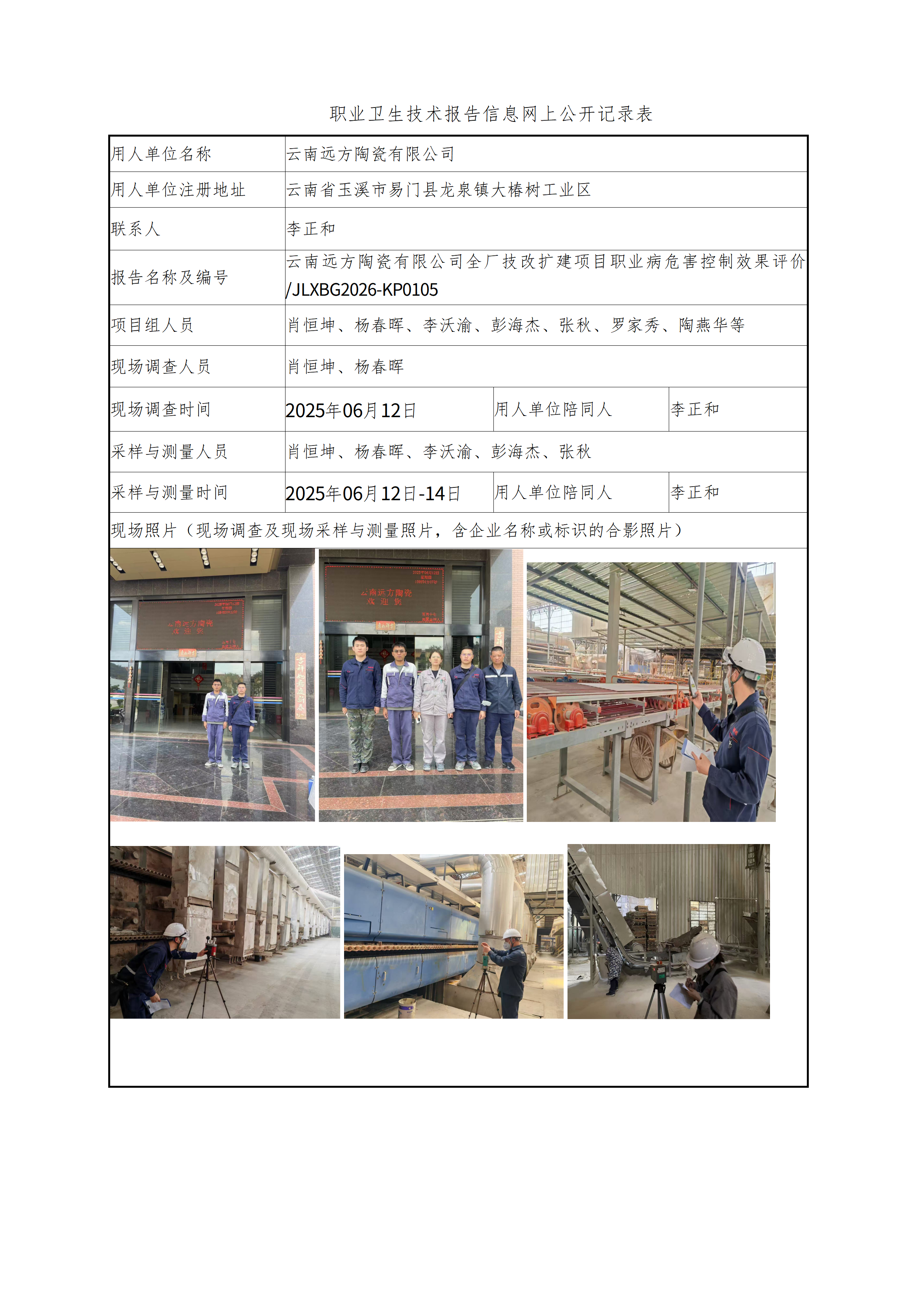 云南远方陶瓷有限公司全厂技改扩建项目职业病危害控制效果评价