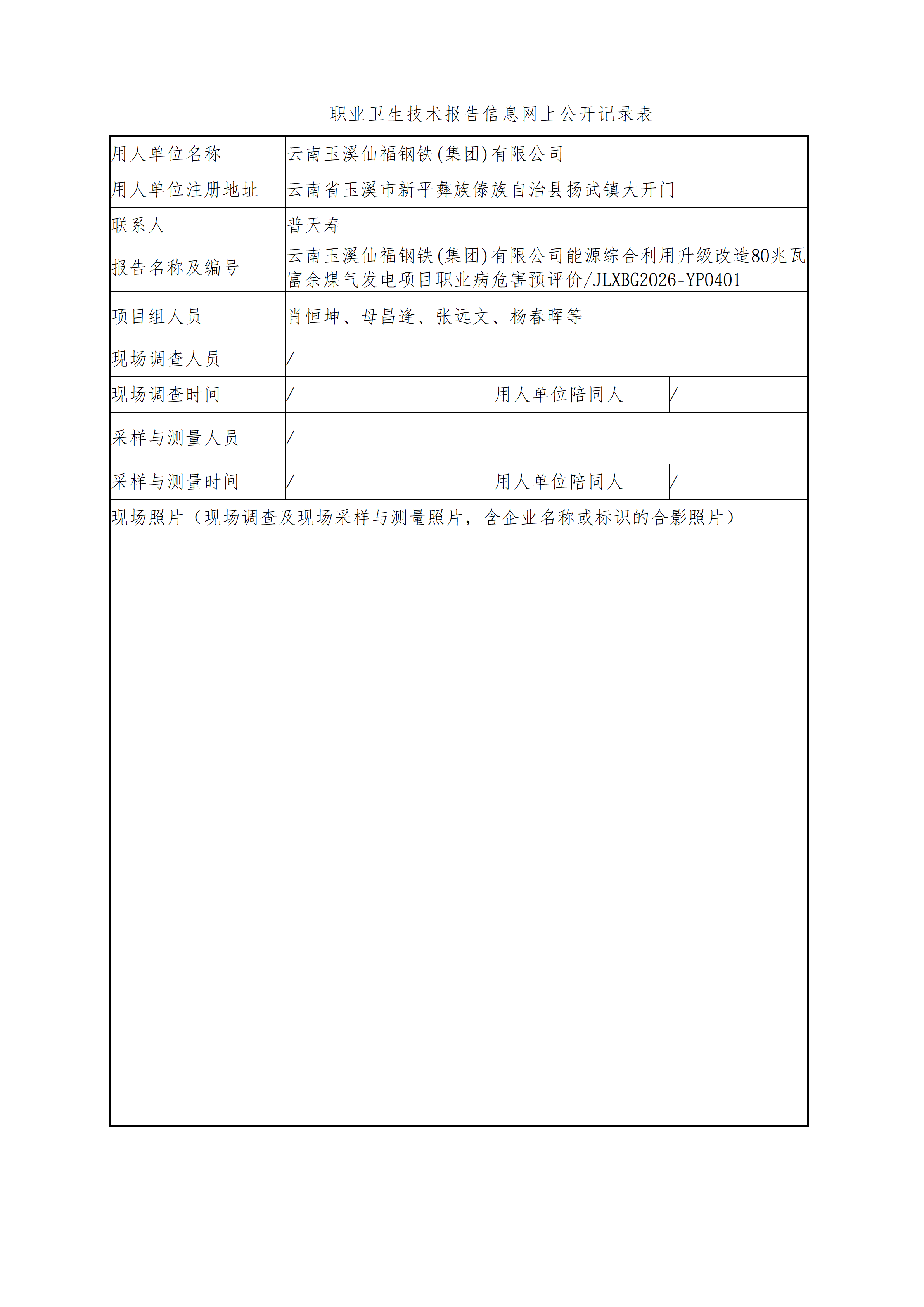 云南玉溪仙福钢铁(集团)有限公司能源综合利用升级改造80兆瓦富余煤气发电项目职业病危害预评价