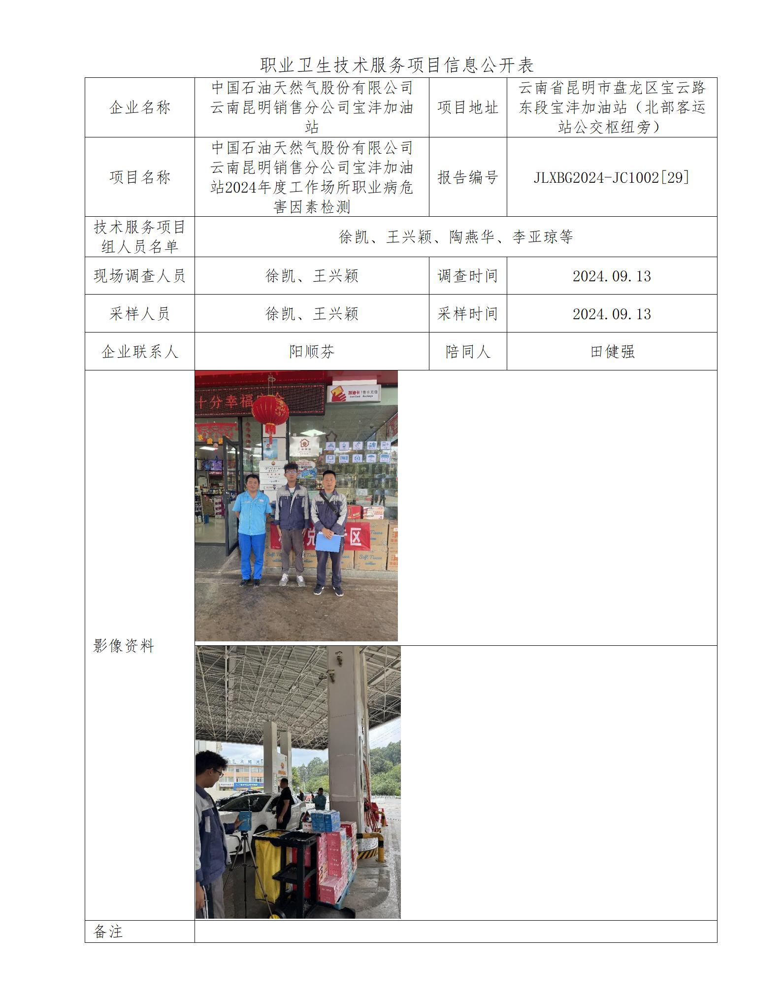 中国石油天然气股份有限公司云南昆明销售分公司宝沣加油站2024年度工作场所职业病危害因素检测