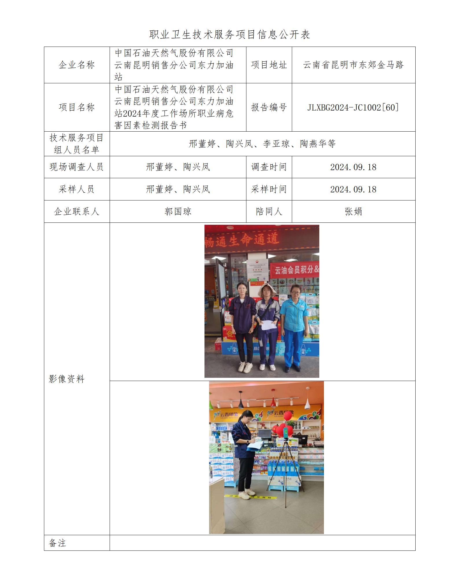 中国石油天然气股份有限公司云南昆明销售分公司东力加油站2024年度工作场所职业病危害因素检测报告书