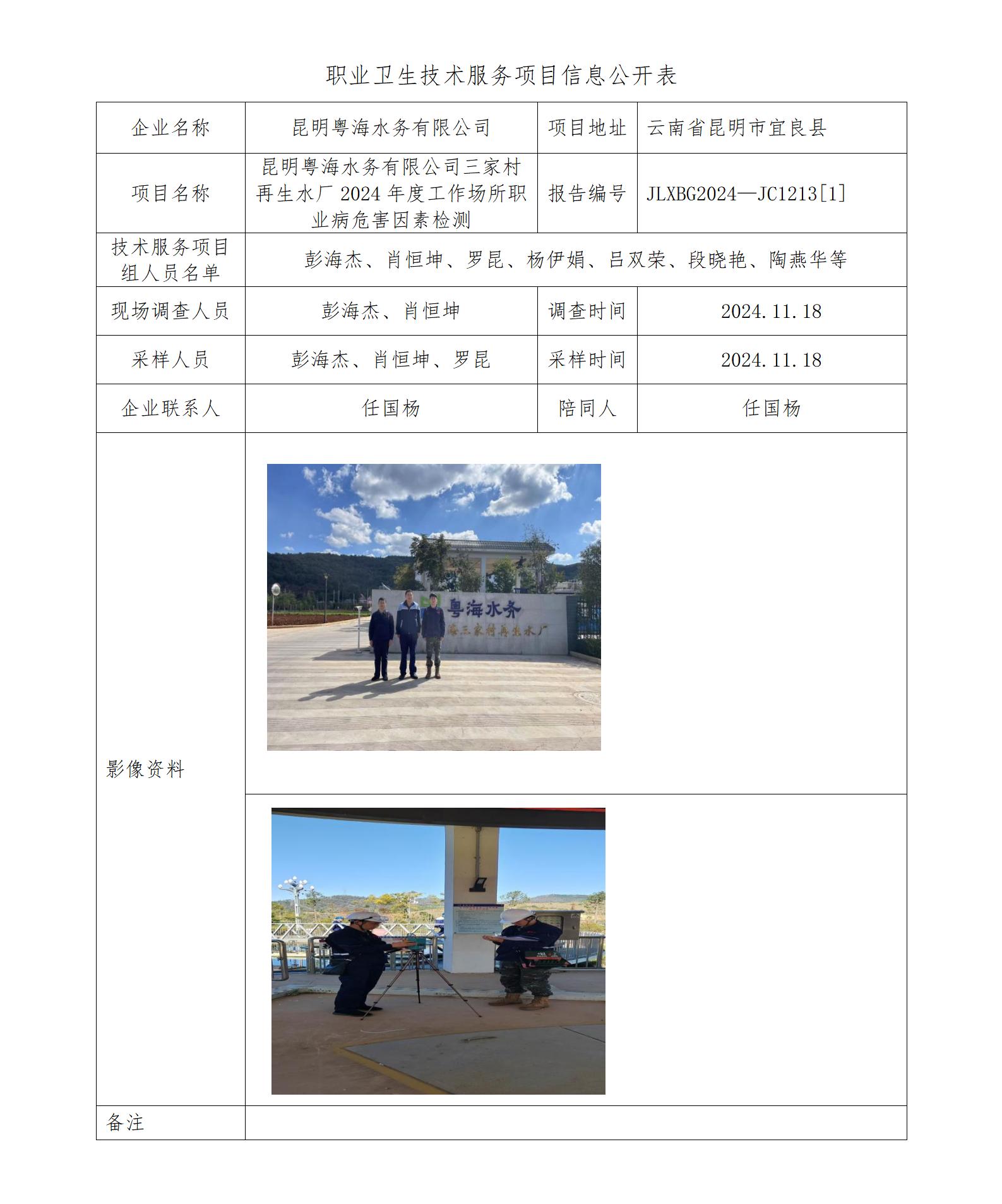 昆明粤海水务有限公司三家村再生水厂2024年度工作场所职业病危害因素检测