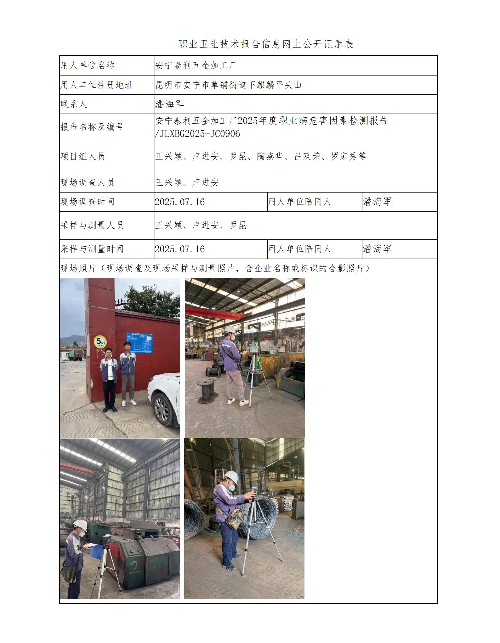 安宁泰利五金加工厂2025年度职业病危害因素检测报告