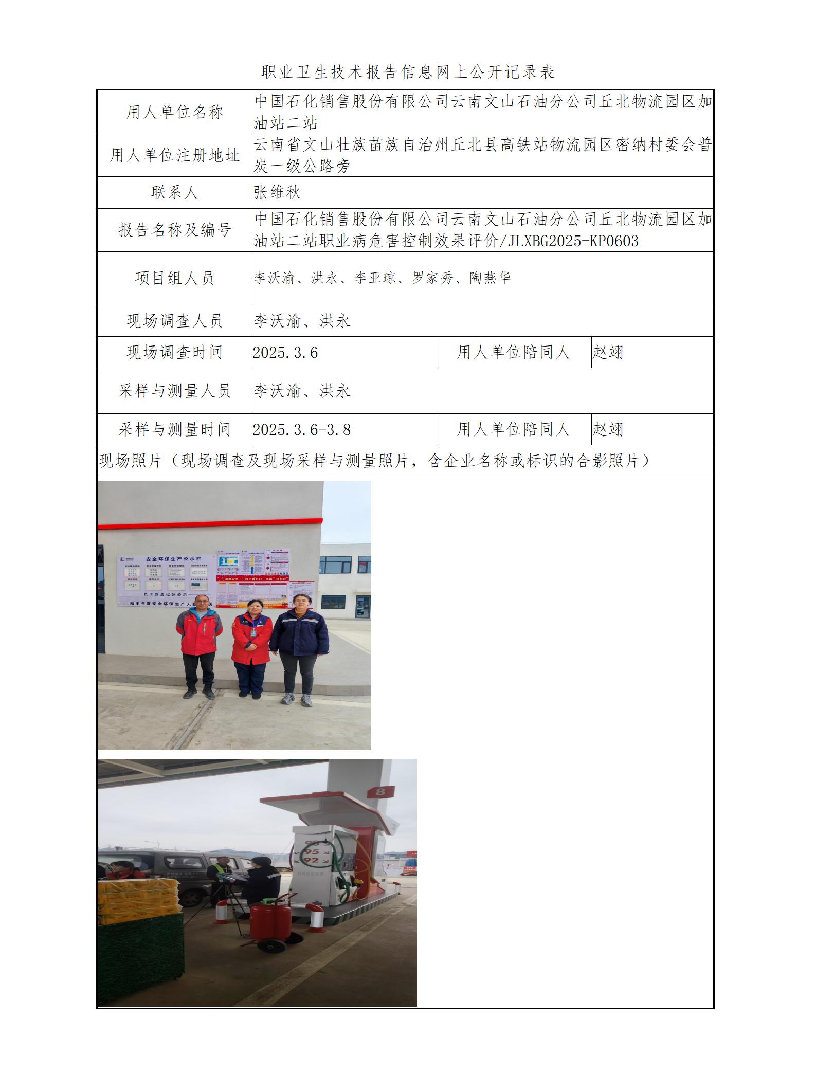 中国石化销售股份有限公司云南文山石油分公司丘北物流园区加油站二站职业病危害控制效果评价