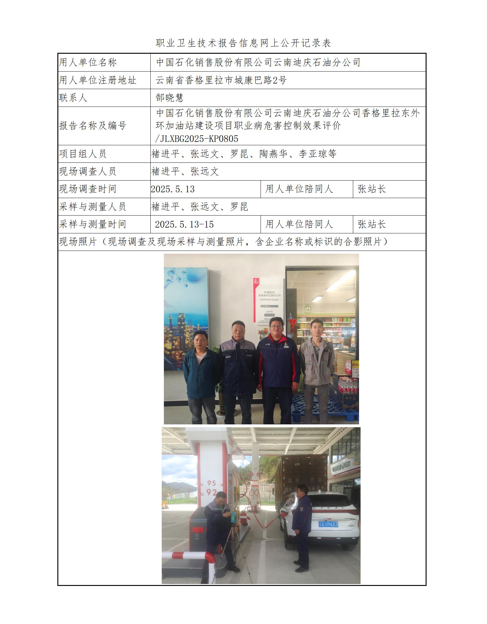 中国石化销售股份有限公司云南迪庆石油分公司香格里拉东外环加油站建设项目职业病危害控制效果评价