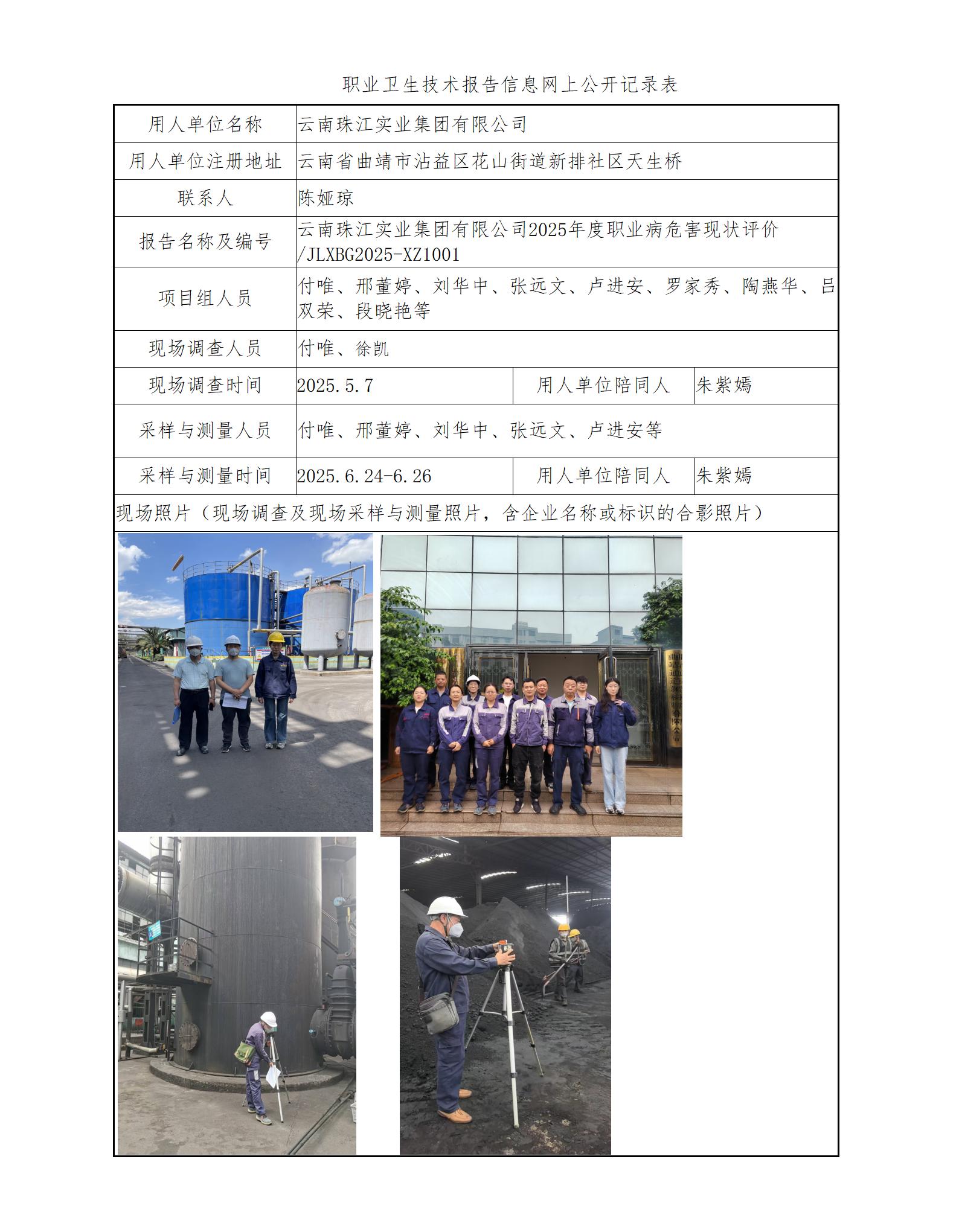 云南珠江实业集团有限公司2025年度职业病危害现状评价