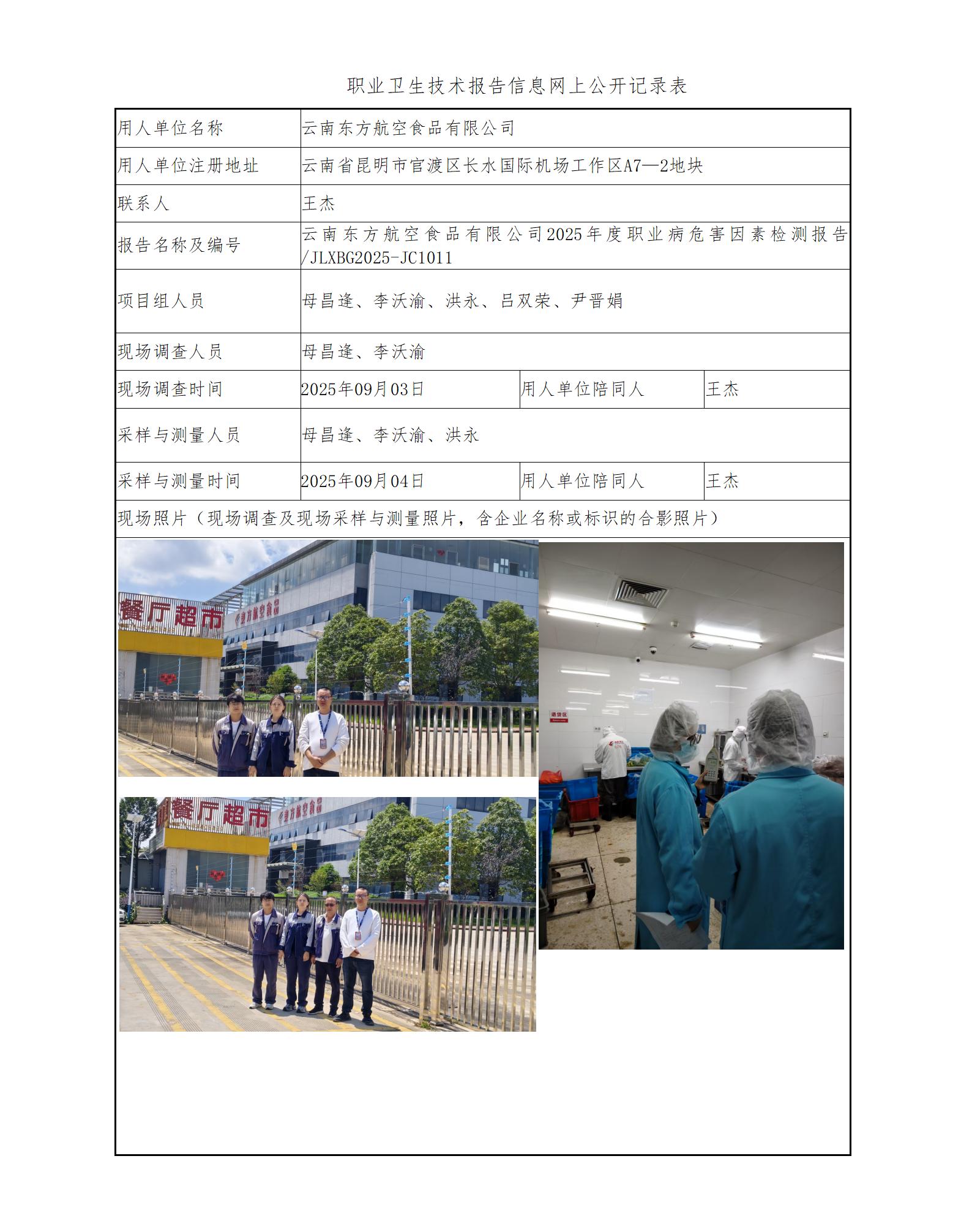 云南东方航空食品有限公司2025年度职业病危害因素检测报告