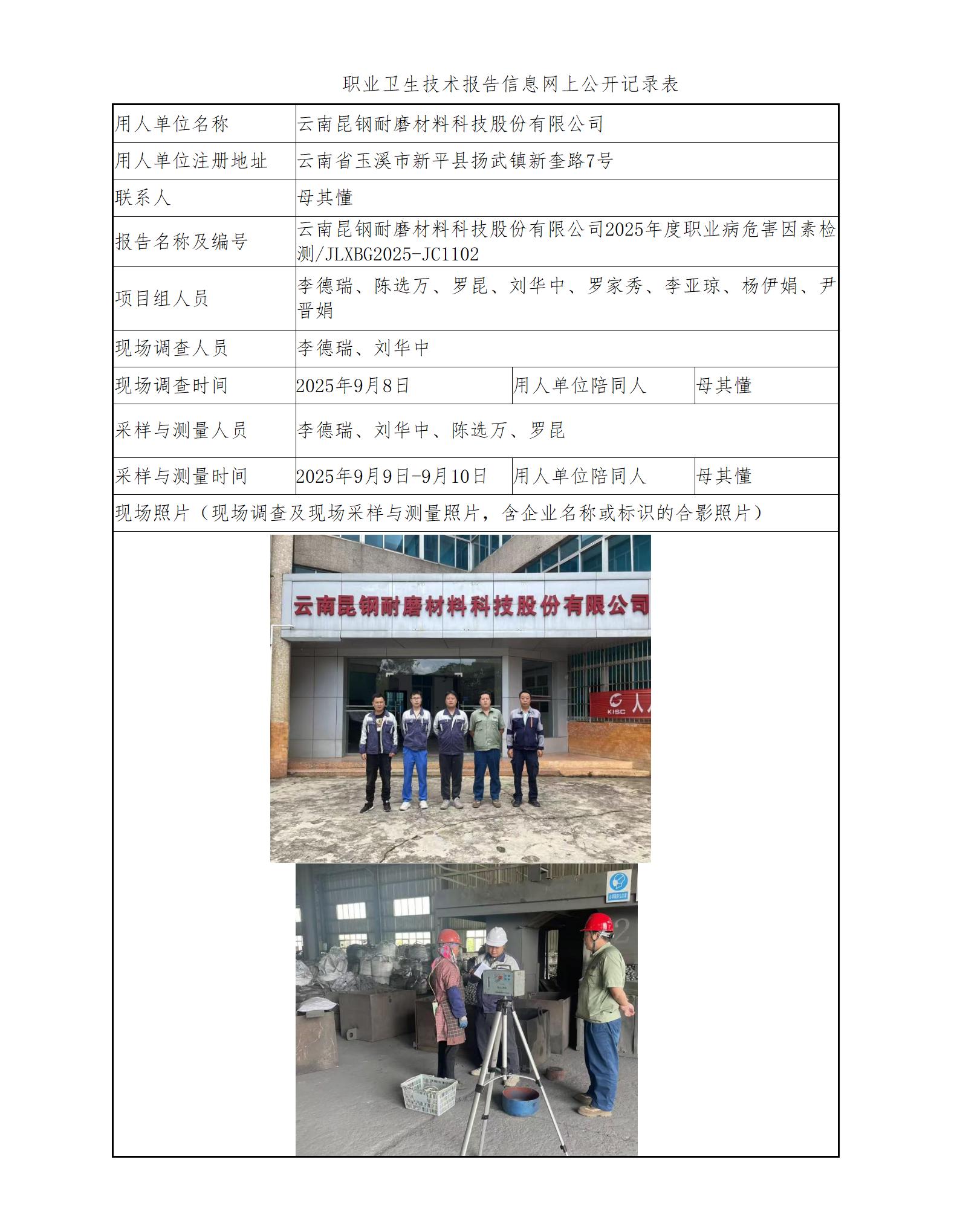云南昆钢耐磨材料科技股份有限公司2025年度职业病危害因素检测