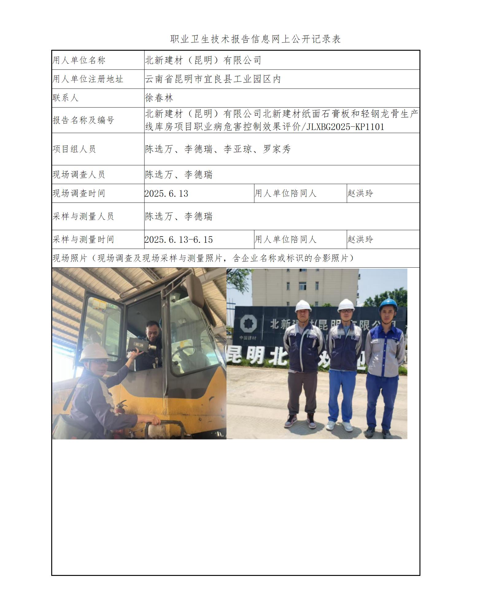 北新建材(昆明)有限公司北新建材纸面石膏板和轻钢龙骨生产线库房项目职业病危害控制效果评价