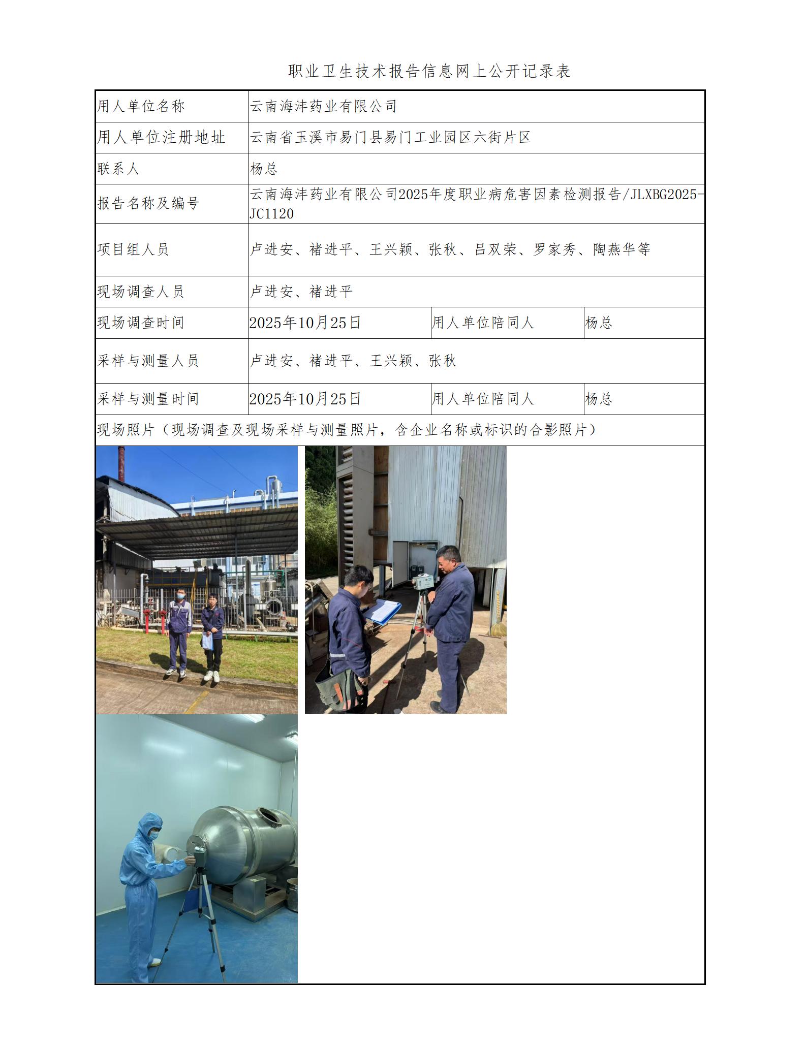 云南海沣药业有限公司2025年度职业病危害因素检测报告