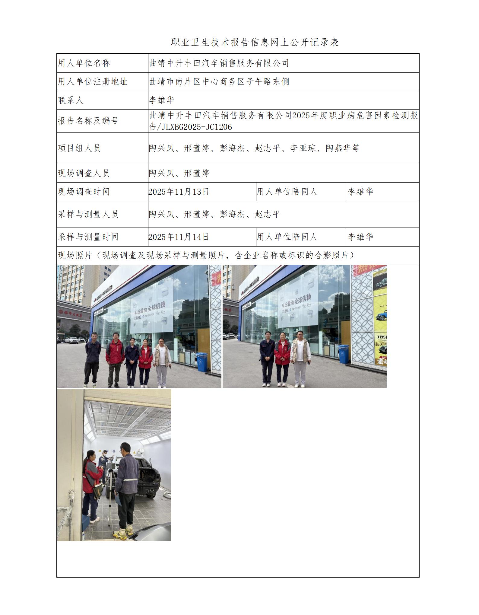 曲靖中升丰田汽车销售服务有限公司2025年度职业病危害因素检测报告