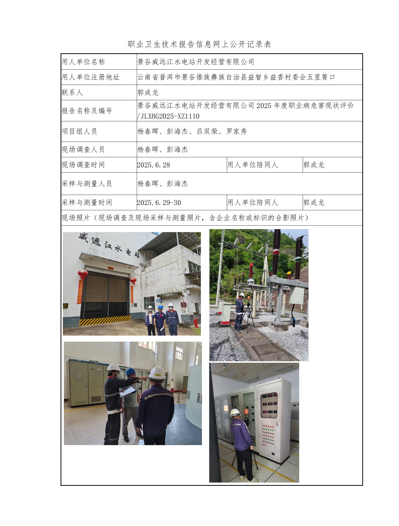 景谷威远江水电站开发经营有限公司2025年度职业病危害现状评价