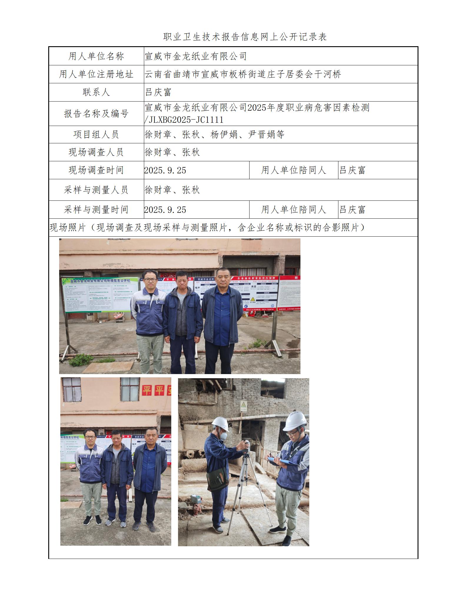 宣威市金龙纸业有限公司2025年度职业病危害因素检测