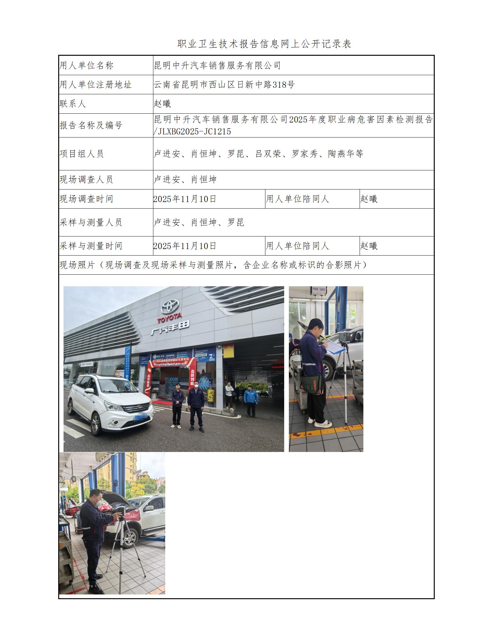 昆明中升汽车销售服务有限公司2025年度职业病危害因素检测报告