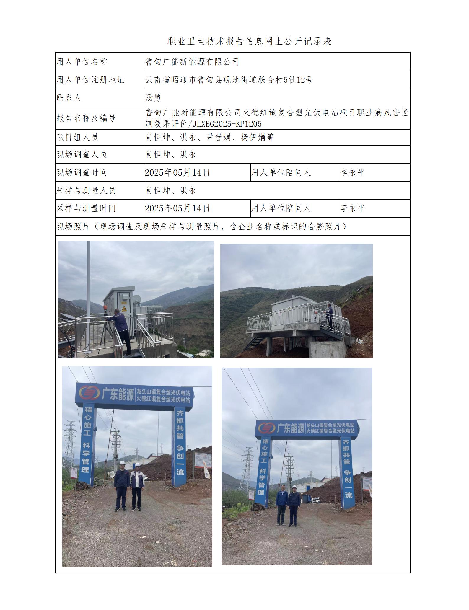 鲁甸广能新能源有限公司火德红镇复合型光伏电站项目职业病危害控制效果评价