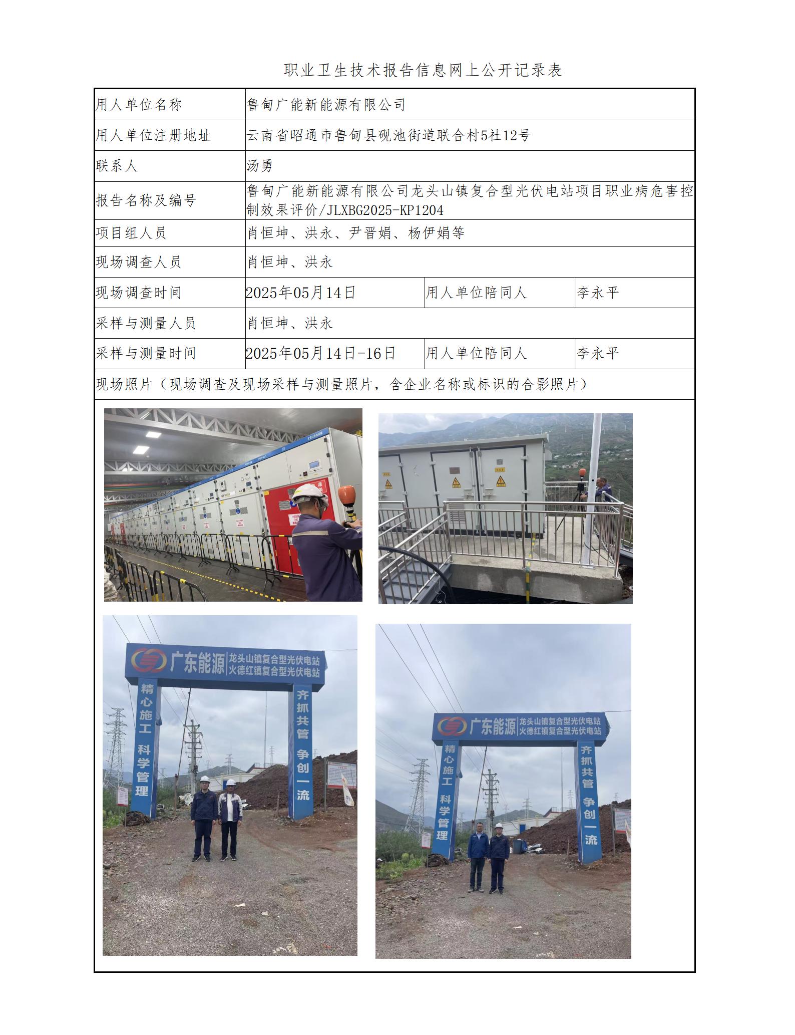 鲁甸广能新能源有限公司龙头山镇复合型光伏电站项目职业病危害控制效果评价