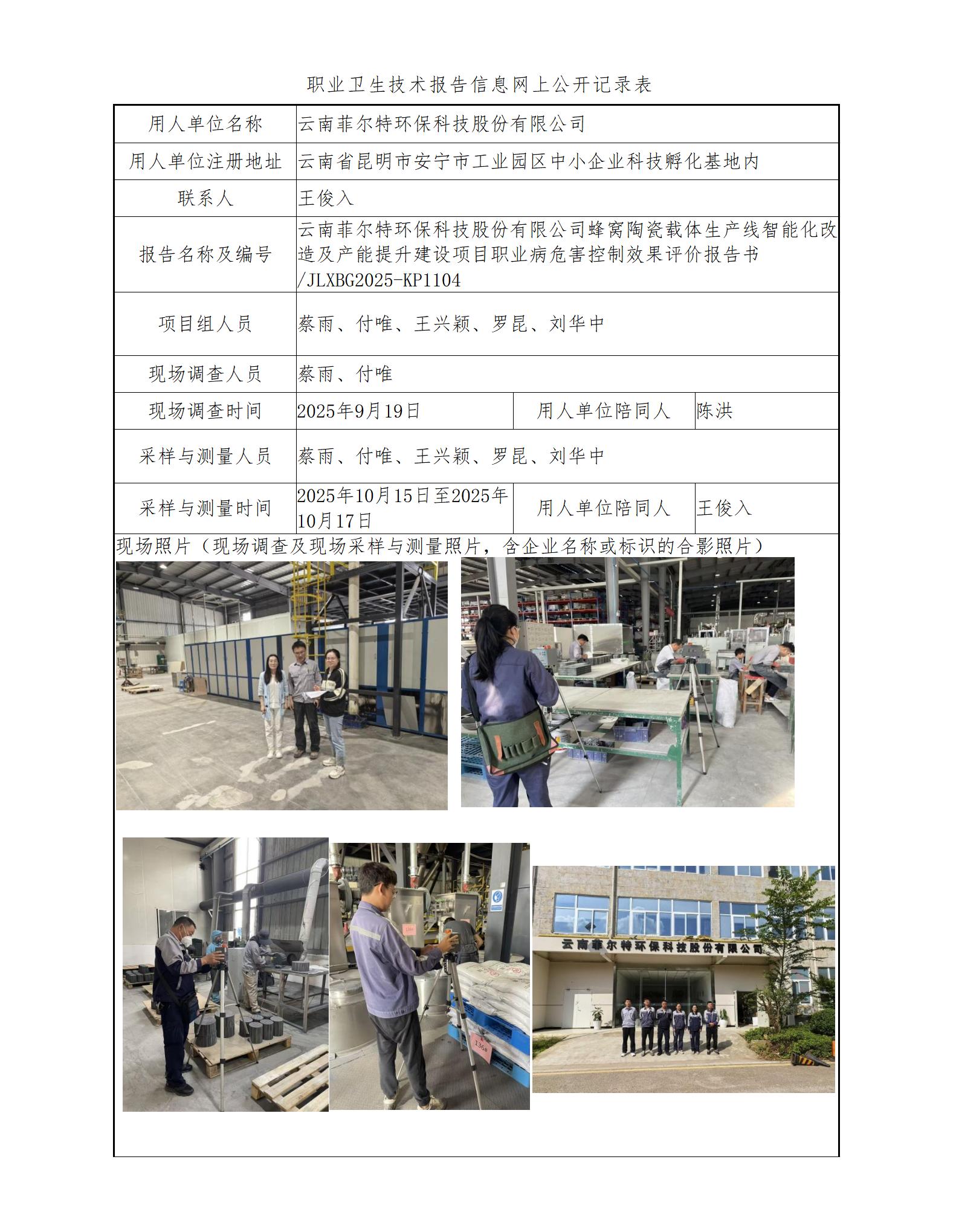 云南菲尔特环保科技股份有限公司蜂窝陶瓷载体生产线智能化改造及产能提升建设项目职业病危害控制效果评价报告书