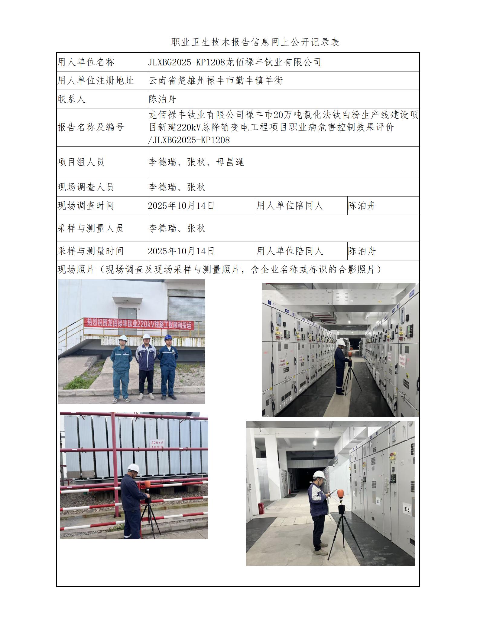龙佰禄丰钛业有限公司禄丰市20万吨氯化法钛白粉生产线建设项目新建220kV总降输变电工程项目职业病危害控制效果评价