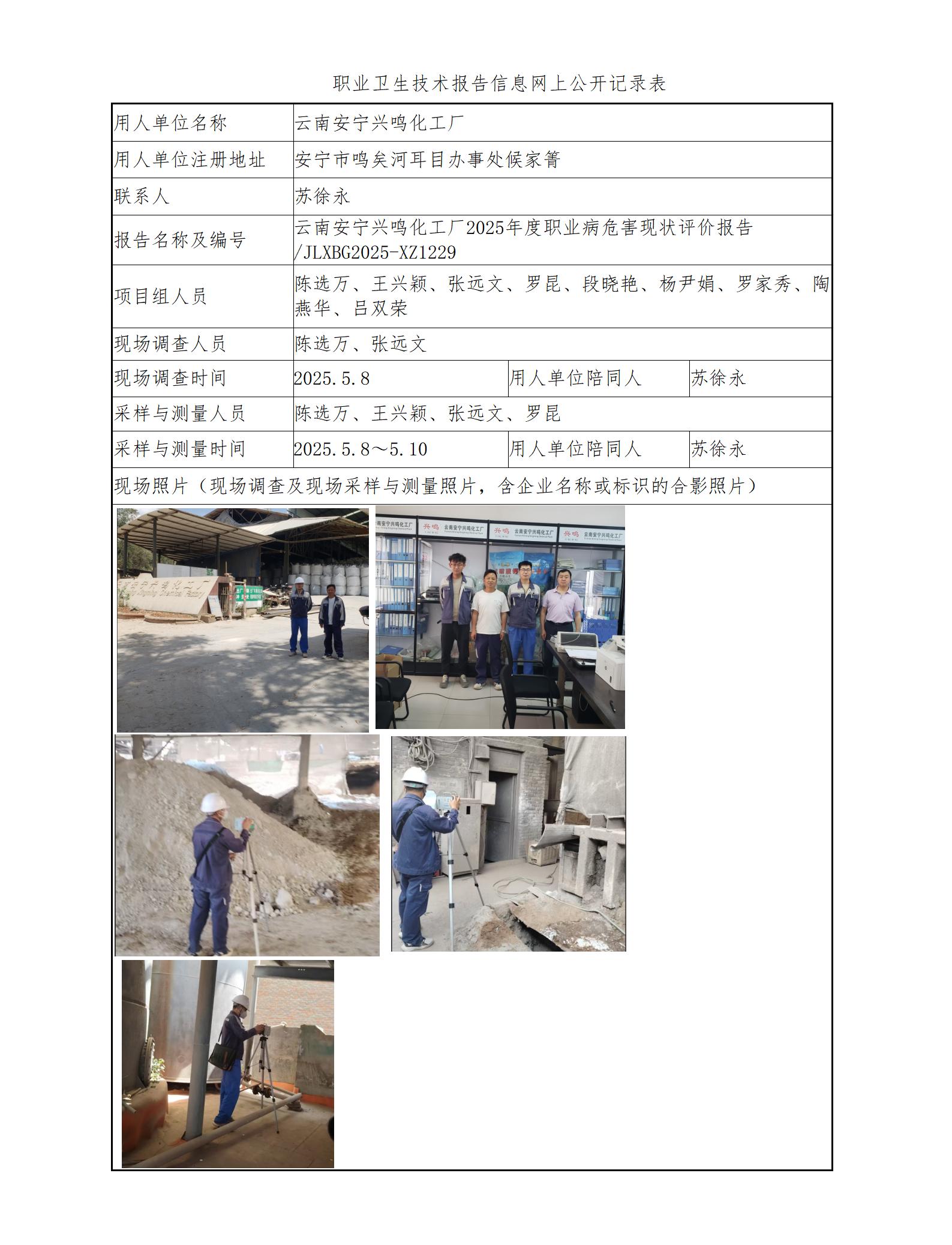 云南安宁兴鸣化工厂2025年度职业病危害现状评价报告