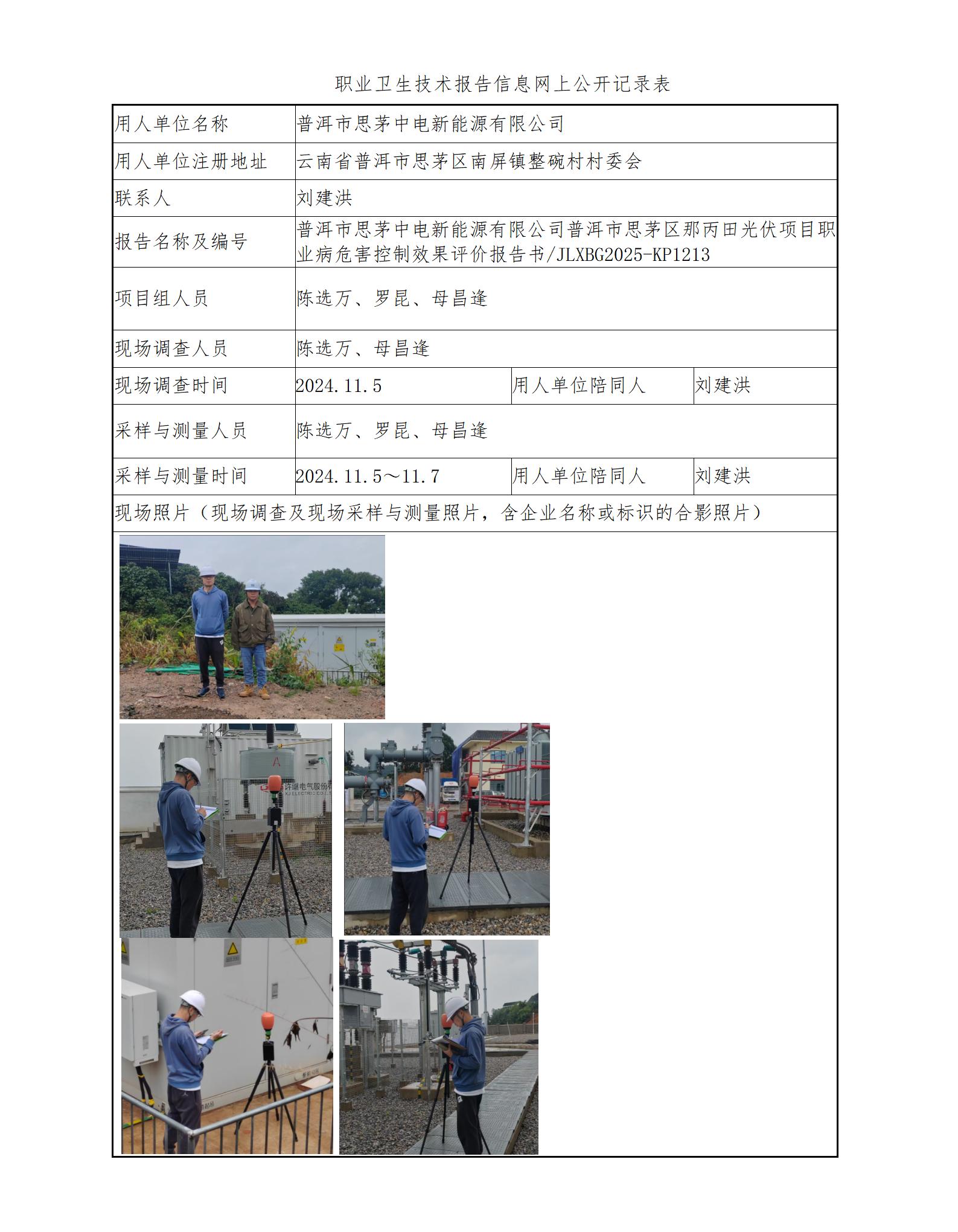 普洱市思茅中电新能源有限公司普洱市思茅区那丙田光伏项目职业病危害控制效果评价报告书
