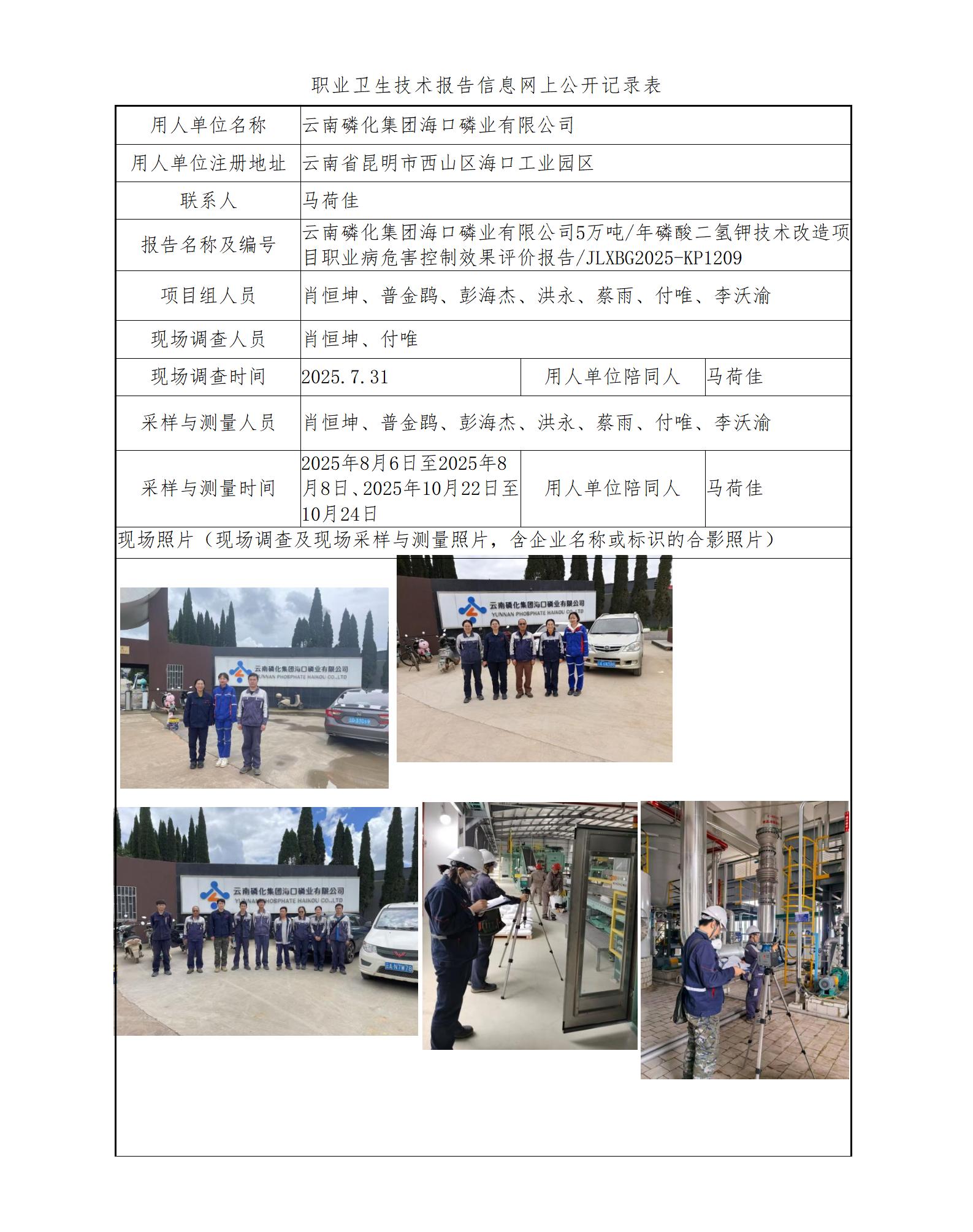 云南磷化集团海口磷业有限公司5万吨/年磷酸二氢钾技术改造项目职业病危害控制效果评价报告