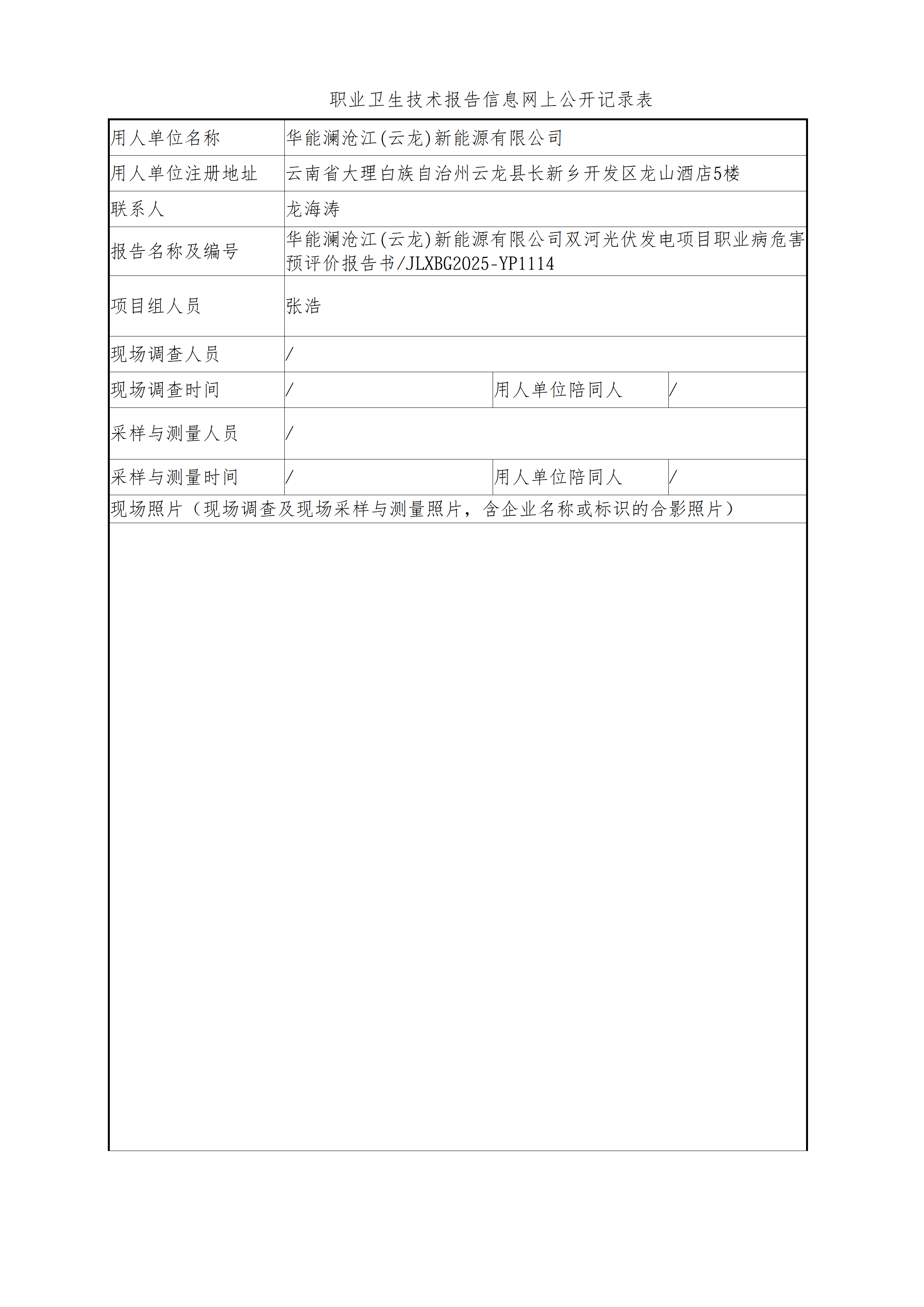 华能澜沧江(云龙)新能源有限公司双河光伏发电项目职业病危害预评价报告书