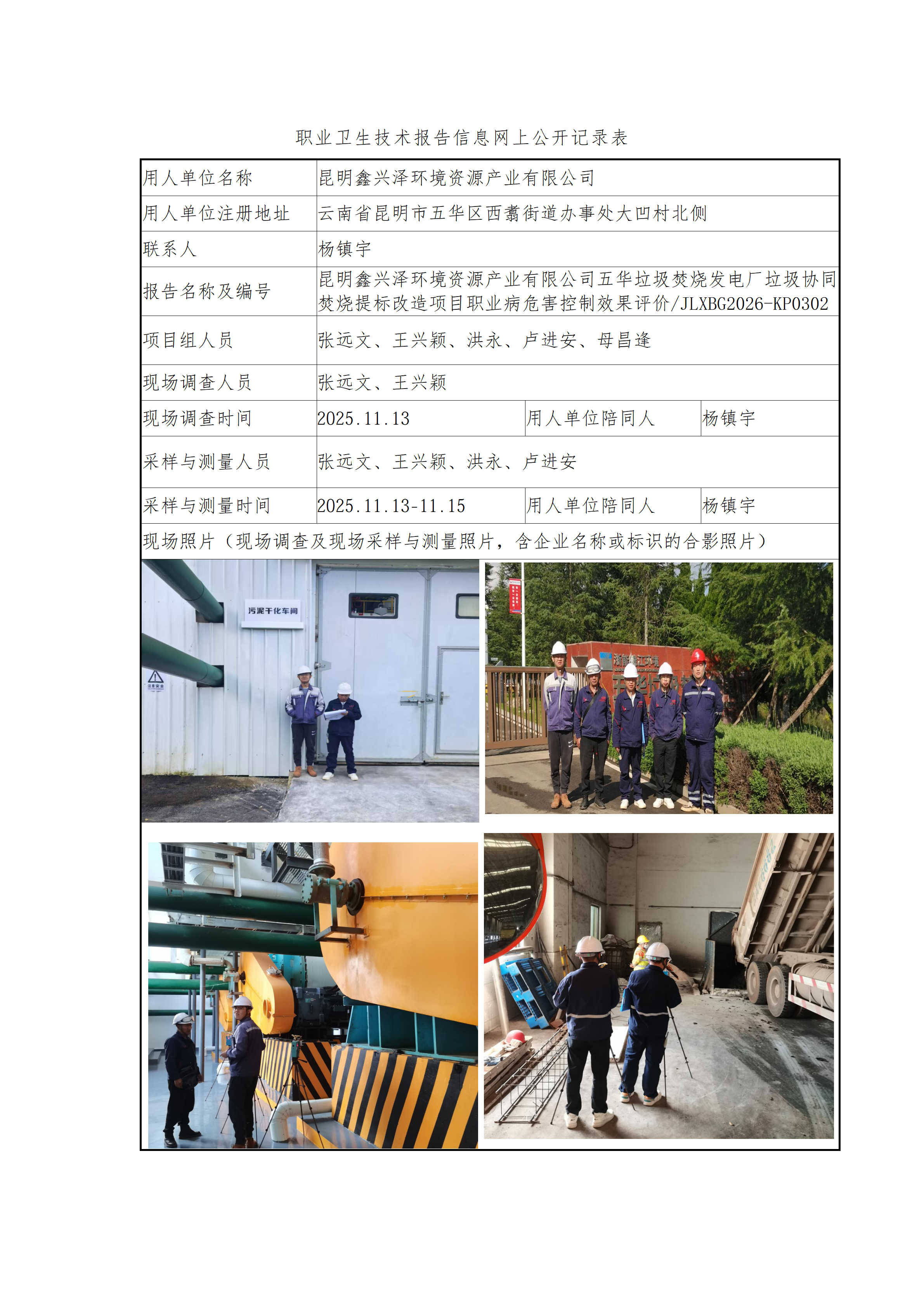 昆明鑫兴泽环境资源产业有限公司五华垃圾焚烧发电厂垃圾协同焚烧提标改造项目职业病危害控制效果评价